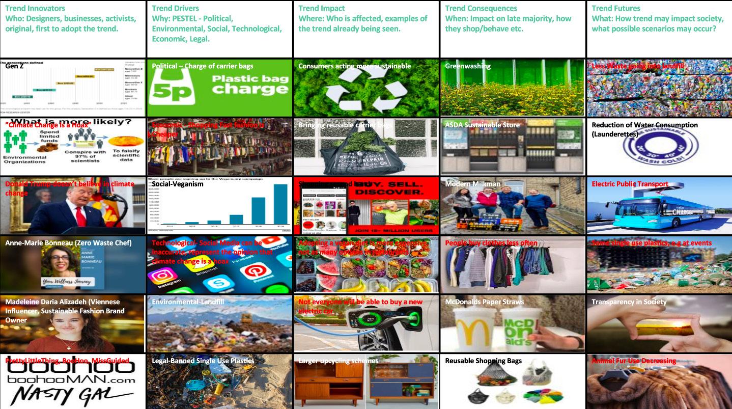A range of methods were utilised to develop research around our chosen theme. Secondary sources included academic books and journal articles to collect information around sustainability in general. To understand consumer’s past responses, Historical Analogy was developed as a method to predict the future climate. Furthermore, primary sources were used, such as newspaper articles, environmental campaigns, and trend reports to apply more relevant and specific research. Trend Cartograms were an important method for researching our chosen theme of Hyperconscious Consumerism, with regards to Sustainable Living. Producing two Trend Cartograms, comparing the best-case scenario to the cross-case scenario, offered a visual representation of raw, strategic information to simplify our group ideas. The framework broke down areas of the trend into who (the innovators), why (the drivers), where (impact), and when (consequences) to derive at potential trend futures (what) regarding consumer behaviour patterns (Raymond, 2010). During the complete research process consideration was given to the characteristics of a good forecaster as proposed by Raymond, which includes scenario planning to prepare for future possibilities (Raymond, 2019).