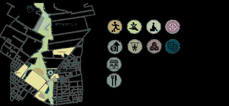 Po med o de una res ructu ac ón de a nf aest uctura v a se p antea a un ordenam ento que perm a una me o ar cu ac ón de cent o h stó co Se p antea a enovac ón urbana de áreas con po enc a de conver se en uga es de encuen ro para a conex ón de os d erentes usua os y espac o de man fes ac ón cu u a Se reub ca espac os que ac ua mente obs ruyen e desa ro o adecuado de as act v dades as m smo como a emode ac ón de nmueb es que actua men e e tan de er o ados y enen potenc a de conver se en espac o que at endan a pub co po sus ca ac er t cas As m smo por med o de as macroman anas e ecupera a a pe tenenc a con e ba r o desa ro ando as recupe ar as cos umbres y t ad c ones V endo as e nuevo e reno como un pun o de conex ón d nám ca de ambos d t tos que pe m a permeab dad de e pac o y os ba r os para e desa ro o de ac v dades cu ura es gas ronóm cas económ cas y oc a es