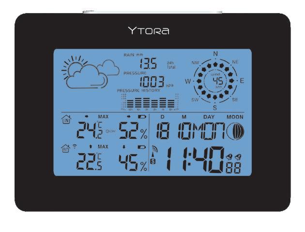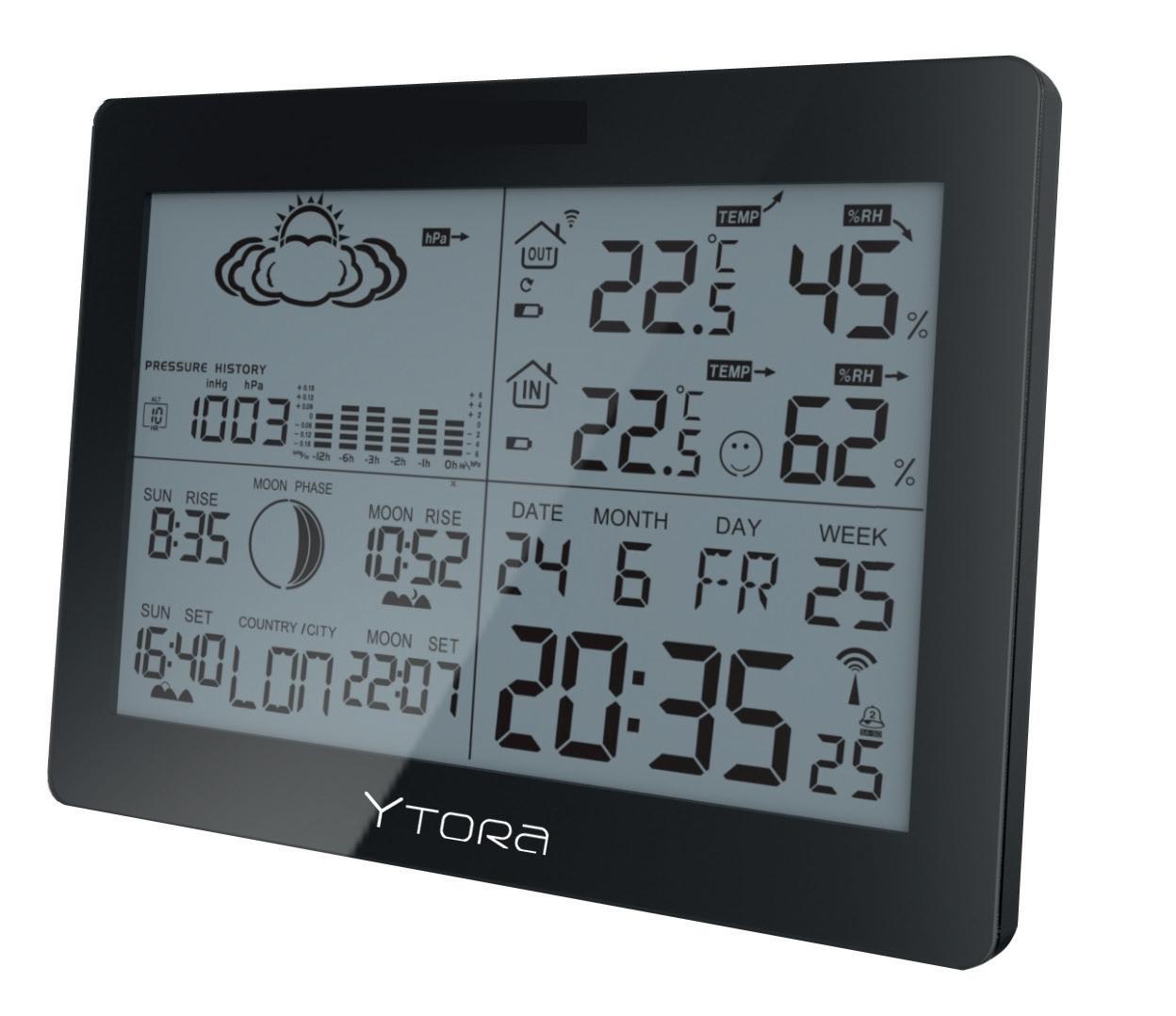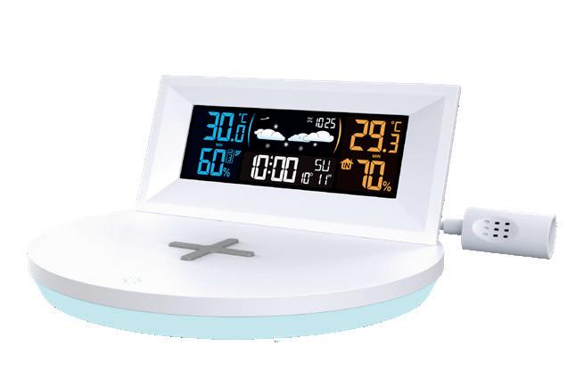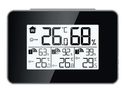 2 | Wetterstation mit Funkfühler und Thermoalarm Wetterstation für die Tisch- oder Wandmontage im modernen Design mit vielen Funktionen, wie z.B. Min.-/Max.Speicher für das Thermo-/Hygrometer, Sonnenauf- und untergang, Mondphasen, Alarm für das Thermometer, Funkuhr mit Wecker uvm. Inkl. Funk-Sensor und Fühler, exkl. Batterien (Gerät benötigt 2× AA, Funk-Sensor benötigt 3× AAA). Masse (L×B×H): 14,8×4,5×11 cm