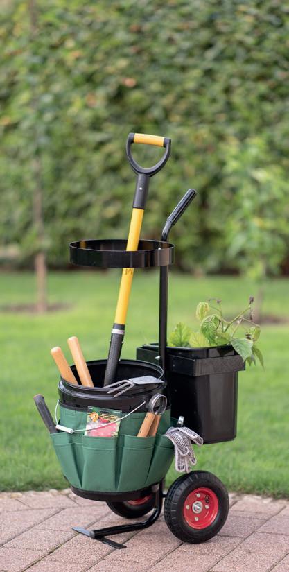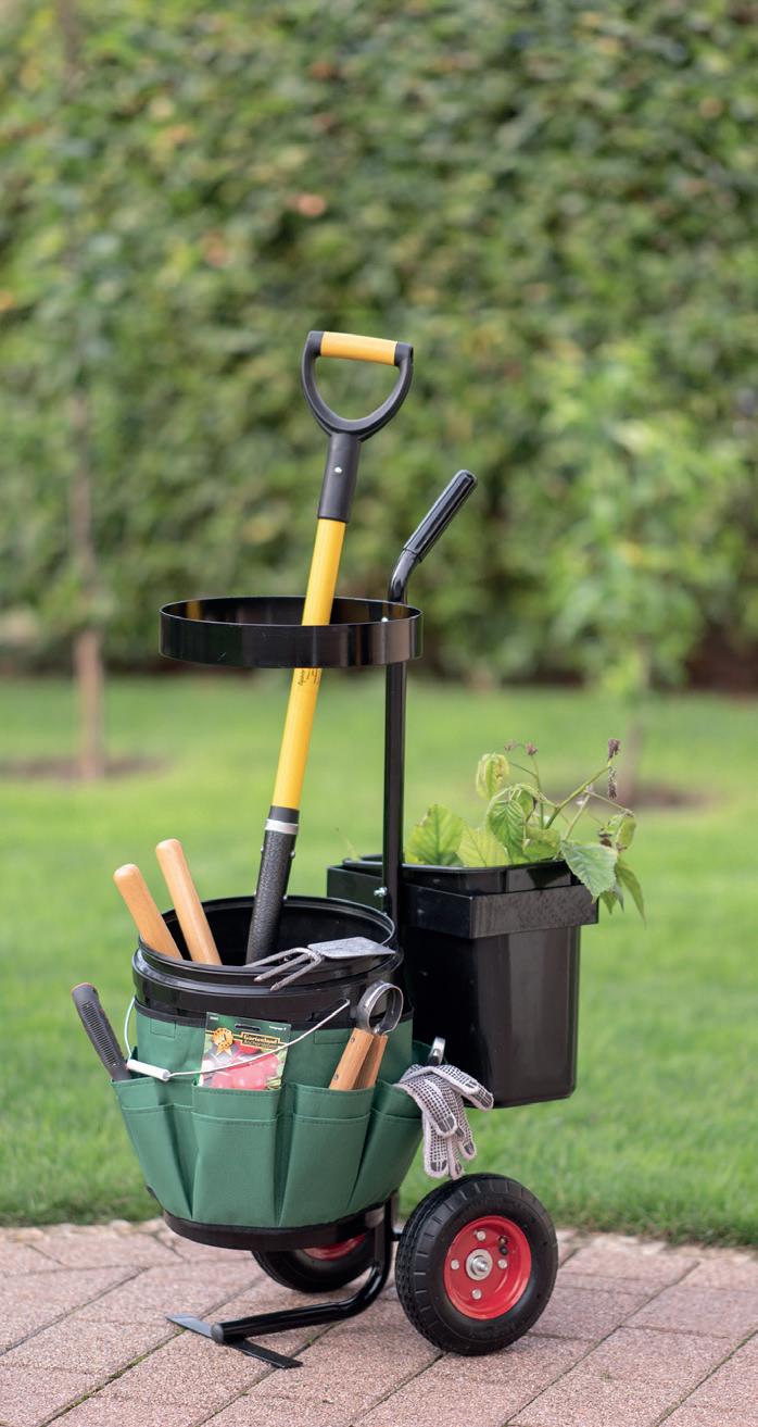 Dieser praktische Gartenhelfer schafft Ordnung und unterstützt bei der Arbeit im Garten und rund um das Haus. Alles ist direkt zur Hand, mit zwei stabilen Eimern (1× eckig, 1× rund) für Gartenabfälle wie Laub und Verschnitt. Der Metallkranz ist ideal für langstielige Schaufeln, Spaten oder Rechen sowie einen Werkzeuggurt für Gartenscheren & Co. Der universell einsetzbare Trolley spart nicht nur Arbeitszeit, sondern auch Laufwege. Die Reifen lassen sich mit Luft befüllen, somit sind sie leichtgängig und ermöglichen ein bequemes Ziehen durch unwegsames Gelände. Der Rahmen ist stabil und aus beschichtetem Stahl gefertigt. Der Werkzeuggurt aus hochwertigem Polyester sorgt für eine lange Lebensdauer. Gewicht: ca. 7,5 kg, Masse (L×B×H): 56×40×104 cm