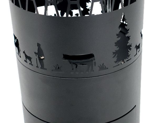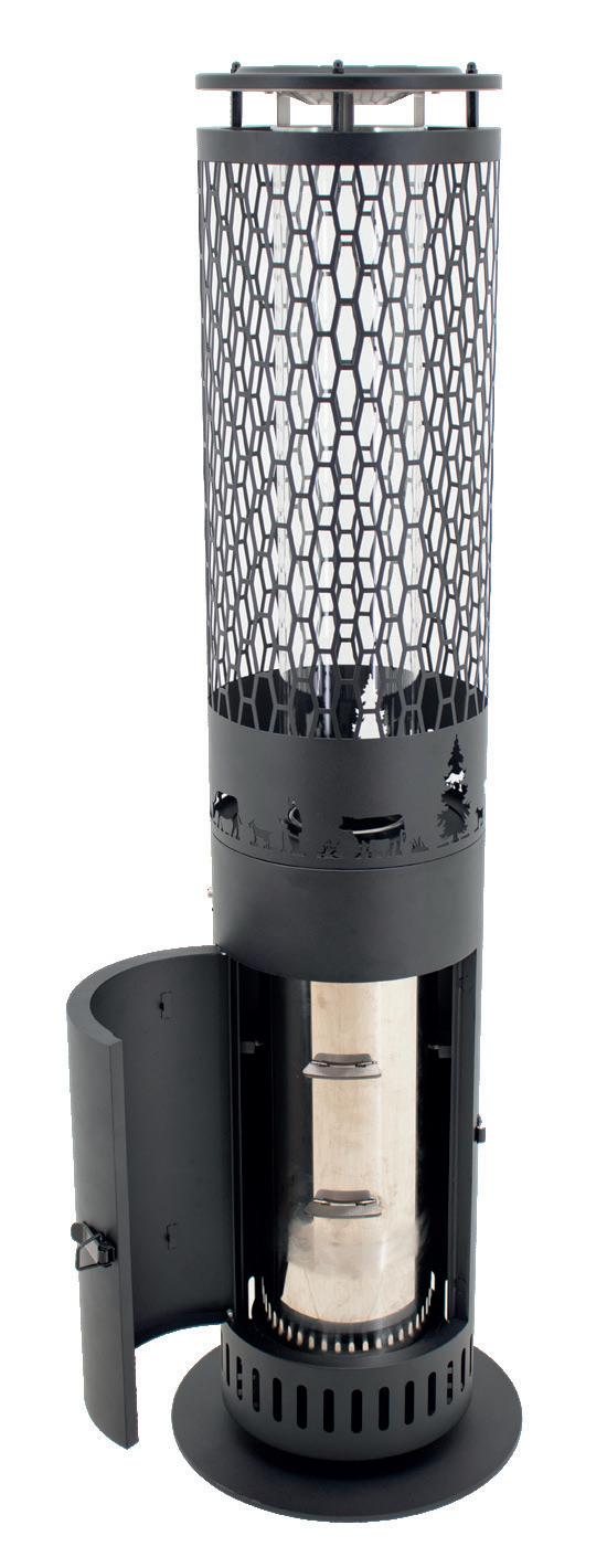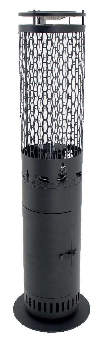 Alpaufzug-Design. Betrieben mit Holzpellets, spendet sie wohltuende Wärme und zaubert bei Dämmerung ein stimmungsvolles Flammenspiel.