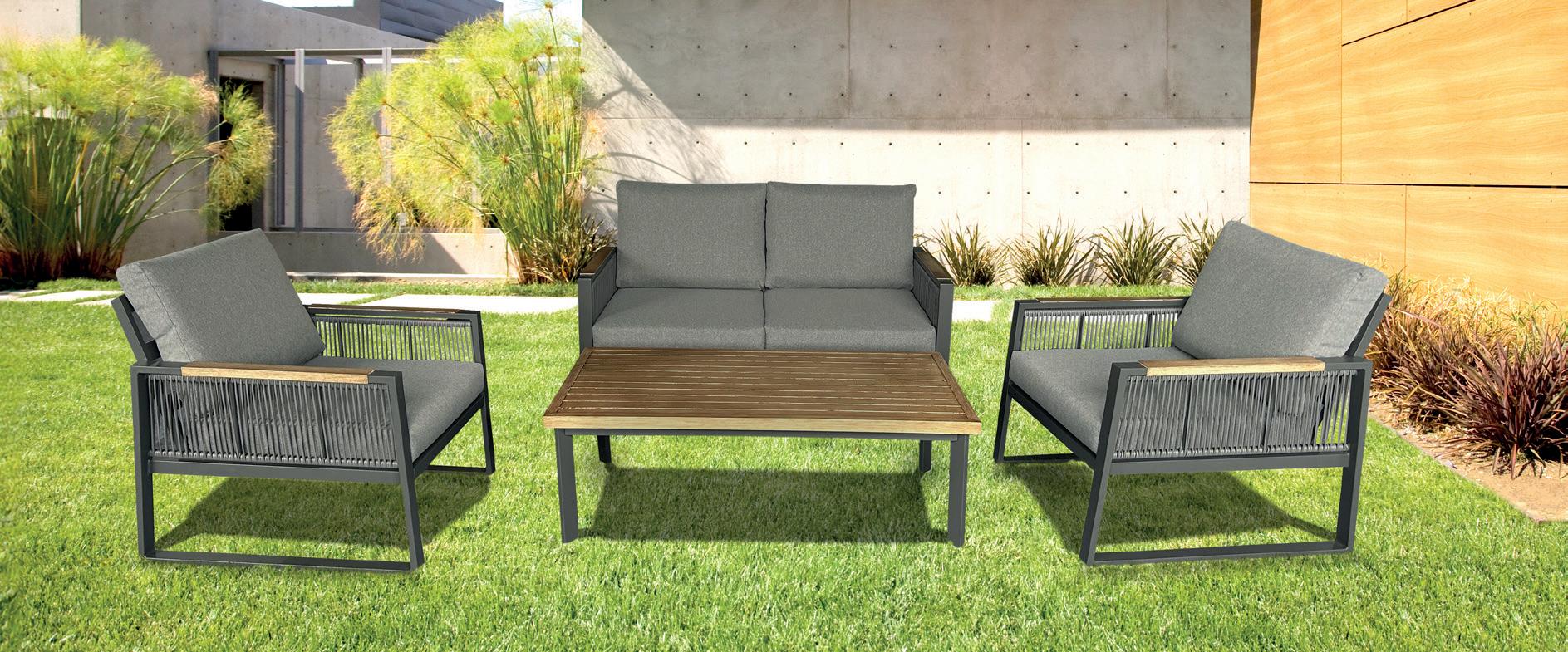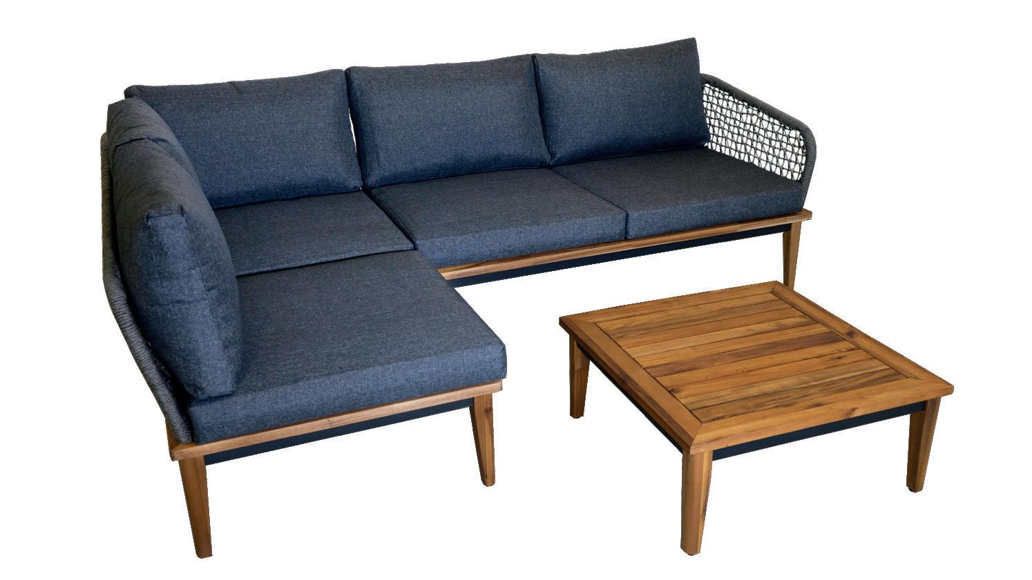 Die Ecklounge aus FSC®-zertifiziertem Akazienholz mit Teak-Finish und anthrazitfarbenes Seilgeflecht verbindet zeitloses Design mit hohem Komfort – ideal für entspannte Sommermomente.