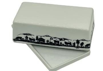 Beurrier en porcelaine, blanc avec motif de silhouette. Dim. (L×l×h): 15,7×8,5×5 cm