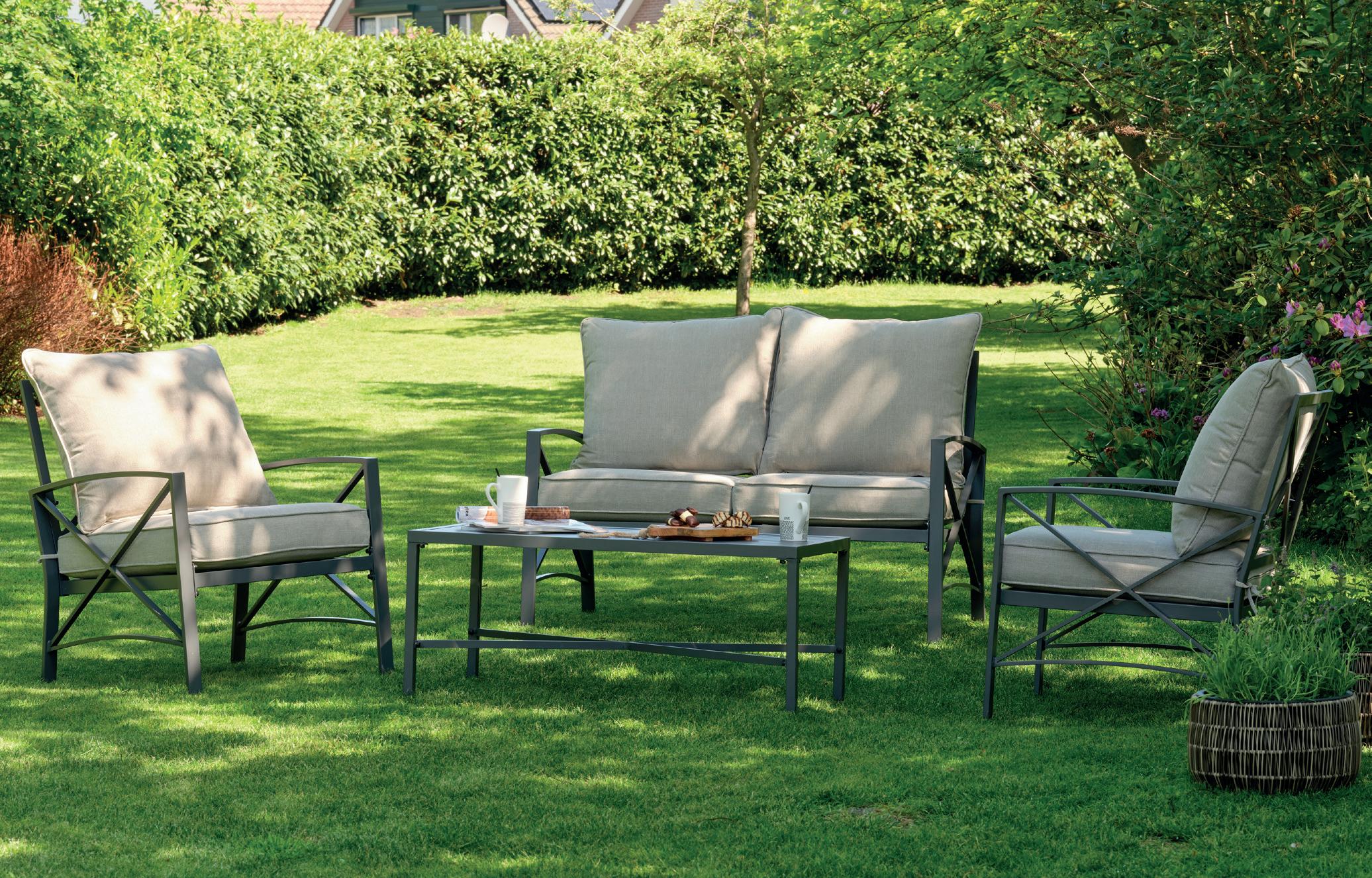 L’ensemble de 8 pièces se compose de: Dimensions (L×l×h) 2× fauteuils 65×63×74 cm, 1× canapé à 2 places 113×65×74 cm, 1× table 58,5×58,5×43 cm. 4 coussins, hauteur d’assise: 36 cm, poids total: env. 34 kg.