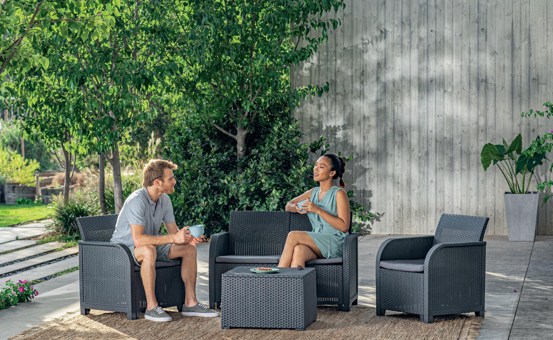Avec ses bras ronds et son dossier ergonomique, cette garniture a un aspect attrayant. Avec coussins et table de rangement pour garder vos coussins propres et secs Fabriqué en osier synthétique résistant aux intempéries et nécessitant peu d’entretien.