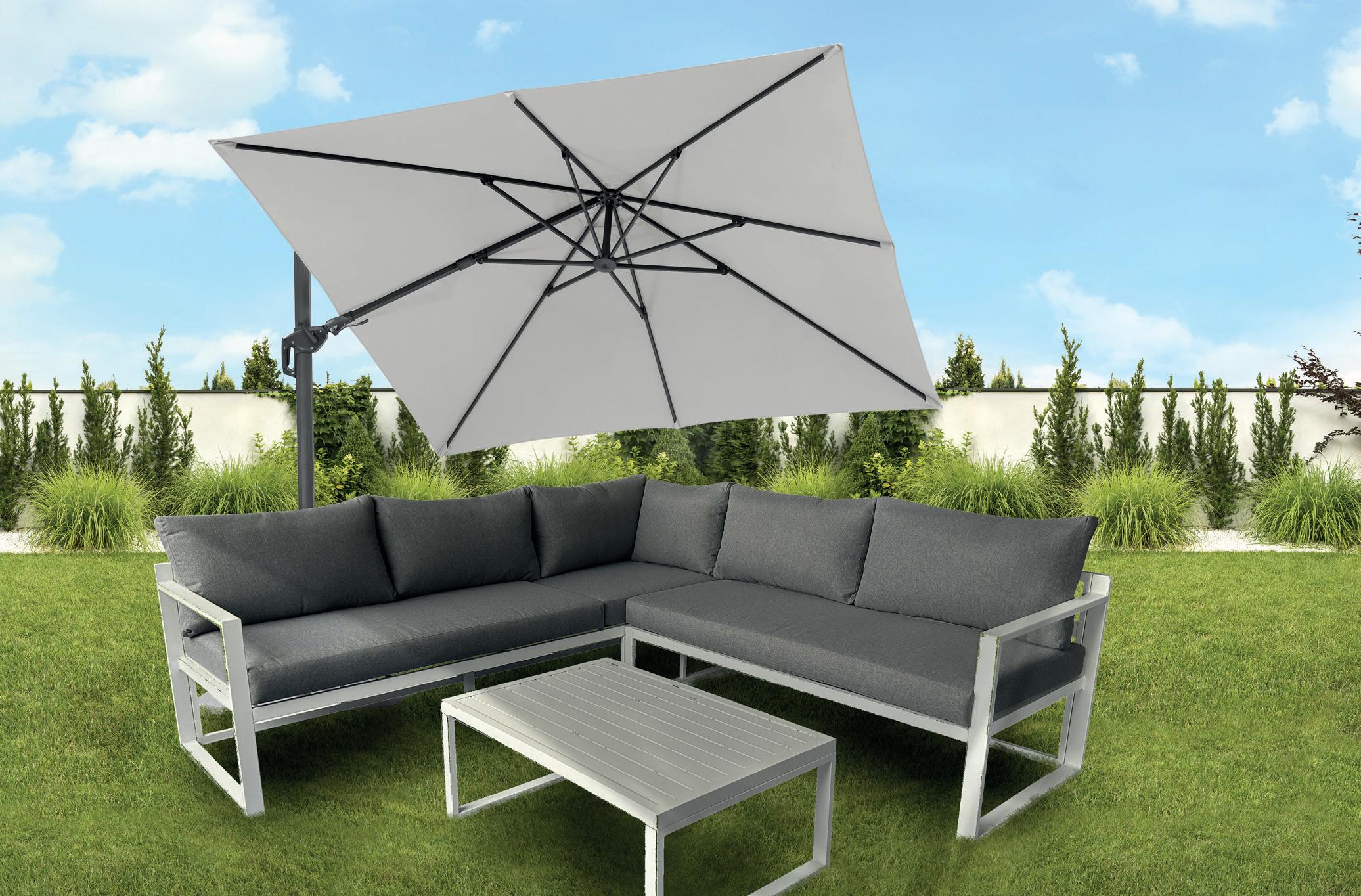Der Sonnenschirm verfügt über eine Bespannung, die zu 100% aus Polyester mit ca. 180 g/m² besteht. Sie ist verrottungsfest, wasserabweisend imprägniert und bietet einen UV-Schutz von 50+. Das Alu/Stahl-Gestell ist anthrazitgrau pulverbeschichtet. Der Sonnenschirm hat eine einstellbare Dachneigung bis 50°, eine beidseitige Kippfunktion bis 45° und ist per Drehgelenk mit dem Fusspedal um 360° drehbar. Masse Schirmfläche (L×B): 270×270 cm