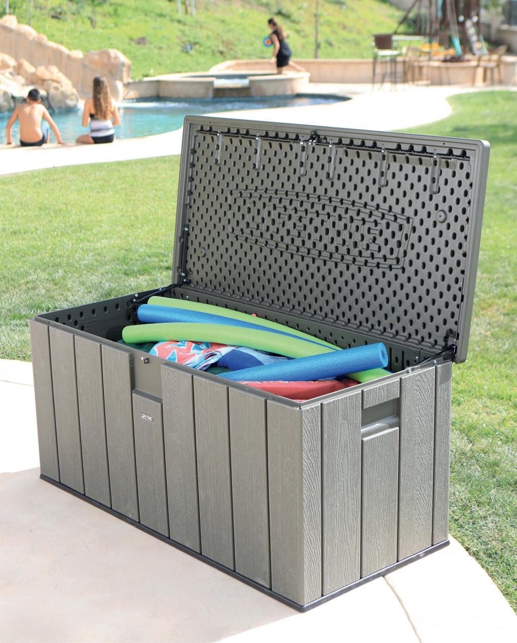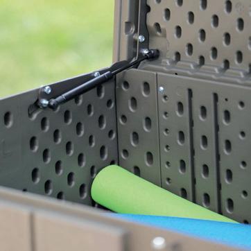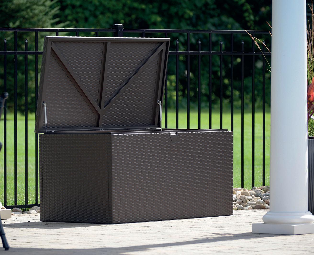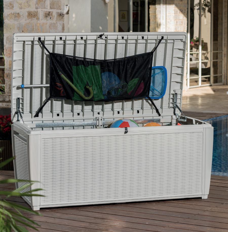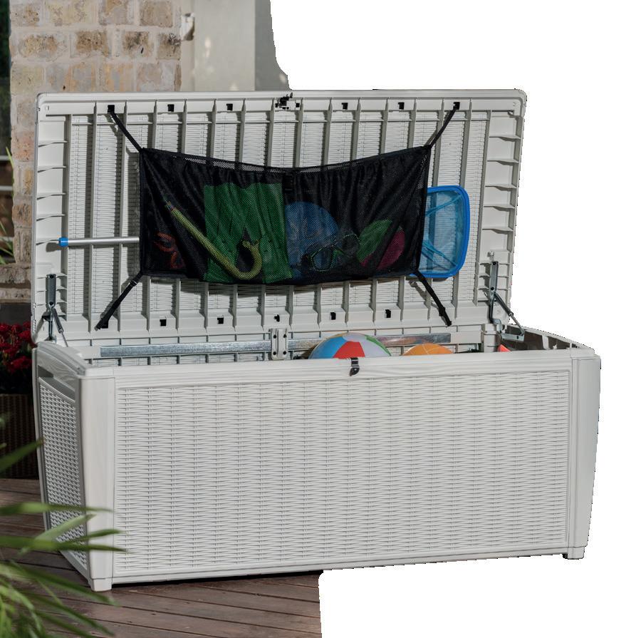 Multifunktionelle Gartenboxen in schöner Rattan-Optik mit viel Stauraum, welche mit einer Kapazität von 511 Liter punktet. Die Box kann auch als Sitzgelegenheit genutzt werden. Mit eingebautem, automatischem Öffnungsmechanismus, inkl. Deckelnetz und Netz-Korb. Sie ist wetter- und UV-beständig, inkl. Schlossvorrichtung (exkl. Schloss), einfache Montage, Masse (L×B×H): 145×73×64 cm.
