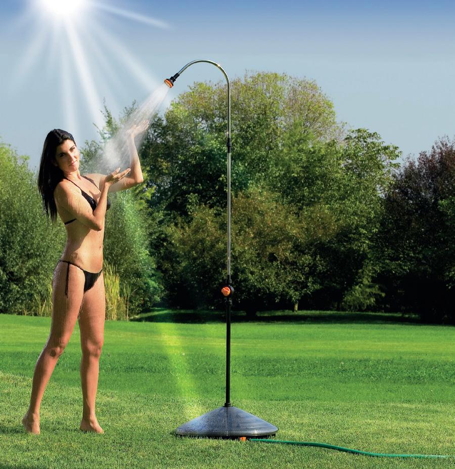 Sie möchten im Garten, auf der Terrasse oder im Schrebergarten duschen – aber bitte nicht mit kaltem Wasser. In diesem Fall ist diese Dusche genau das Richtige. Durch die Sonne wird das im Sockel befindliche Wasser immer auf bis zu 60° C aufgeheizt. Mit dem Mischregler führen Sie Kaltwasser zu und wählen Ihre ideale Wassertemperatur. Masse (Hר): 220×59 cm
