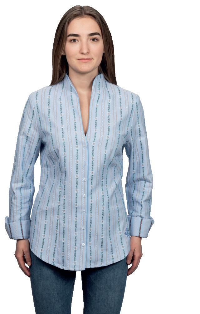 Edelweiss-Bluse langarm, mit Kelchkragen. Material: 78% Baumwolle, 20% Polyester, 2% Elasthan. Waschbar bis 60° C. In den Grössen XS–XXXL erhältlich.
