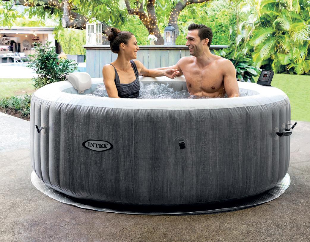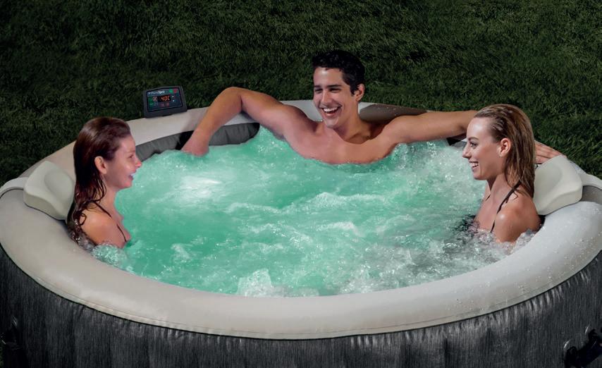 Mit dem Pure Spa können Sie sich in beheiztem Wasser entspannen und von beruhigenden Sprudeldüsen verwöhnen lassen. Das einfach zu bedienende, kabellose Akku-Bedienfeld aktiviert die 140 leistungsstarken Sprudeldüsen. Ein eingebautes Enthärtungssystem macht das Wasser weicher. Die Fiber-Tech-Konstruktion und das stossfeste, dreilagige Laminatmaterial bieten ultimativen Komfort und lange Haltbarkeit. Der Wassertemperaturbereich liegt bei 20° bis 40° C. Einfache Wartung. Stromanschluss (220–240 V). Wasservolumen: 795 Liter (bei 90% Füllmenge). Im Lieferumfang enthalten: 1× isolierte Abdeckung mit Schloss, 1× Filterpumpe, 2× Filterpatronen, 1× Aufbewahrungstasche, 2× Premium PU-Schaum-Kopfstützen, 1× mehrfarbiges LED Licht, 1× Schlauch zum Aufblasen, 1× Repair-Kit und 1× Whirlpool-Steuerung. Gewicht: 38,8 kg, Masse innen (Hר): 71×145 cm, Masse aussen (Hר): 71×196 cm