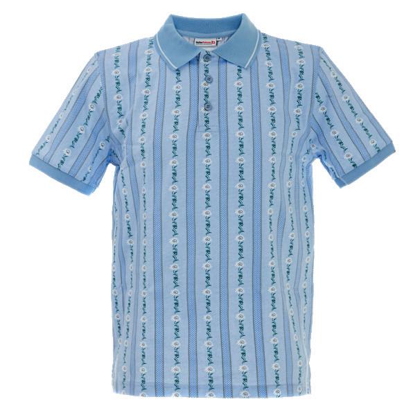 Edelweiss Design, unisex. Material: 100% Baumwolle, Single Jersey 190 g/m2 Knopfleiste mit 3 Knöpfen und Kragen mit Kontraststreifen. Waschbar bis 40º C. In den Grössen XS–XXXL erhältlich.