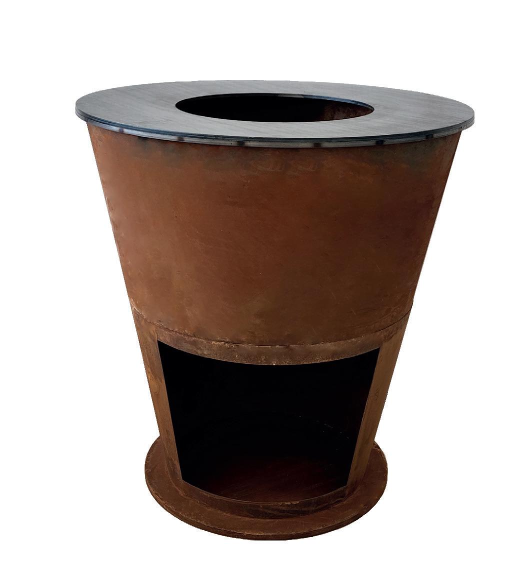 Der Feuerschalen-Grill besteht aus einem konischen Podest, auf welchem direkt die Grillplatte aufgesetzt wird. Die eingebrachte Aussparung kann als praktisches Holzregal genützt werden. Auf der 10 mm starken Stahl-Plancha kann gebrutzelt werden, was die Küche hergibt. Bei einem Durchmesser von 100 cm findet auf der Feuerplatte so einiges Platz. Nach dem Essen nochmals schnell Holz auflegen und die Atmosphäre geniessen. Das Podest wird aus hochwertigem, robustem Cortenstahl in 1,6 mm Materialstärke gefertigt. Mit der Zeit entwickelt Cortenstahl eine unverwechselbare, individuelle Edelrost-Patina, welche die Grillstelle schützt. Das macht sie besonders pflegeleicht und beständig. Sie erhalten einen zusätz lichen Grillaufsatz, welchen Sie direkt über die Feuerstelle legen können.