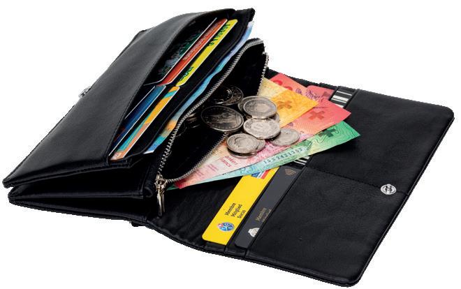 6 | Portemonnaie «Magic» Ganz einfach die Geldnote in die Mitte des Portemonnaies legen und eine Seite drehen, schon ist das Geld im Inneren fest verschnurt. Das Portemonnaie verfügt über 6 Kreditkartenfächer.