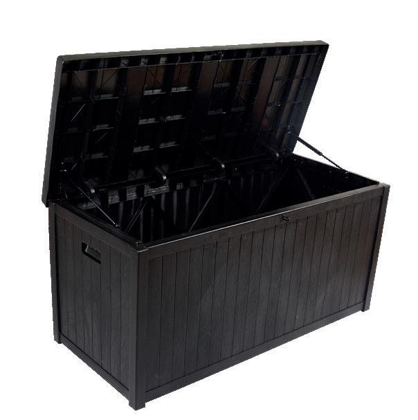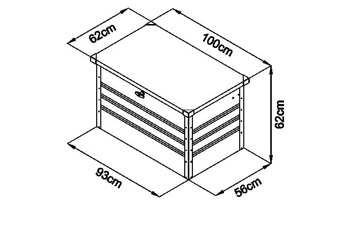 2 | Metallkissenbox «Anthracite» Robuste Gartenbox im modernen Design. Einfacher und unkomplizierter Aufbau. Material: Verzinkter, galvanisierter Stahl ausgestattet mit 2 Gasdruckfedern und abschliessbaren Schloss. Die Box steht auf 4 Kunststofffüssen, die zugleich als Wasserschutz dienen.