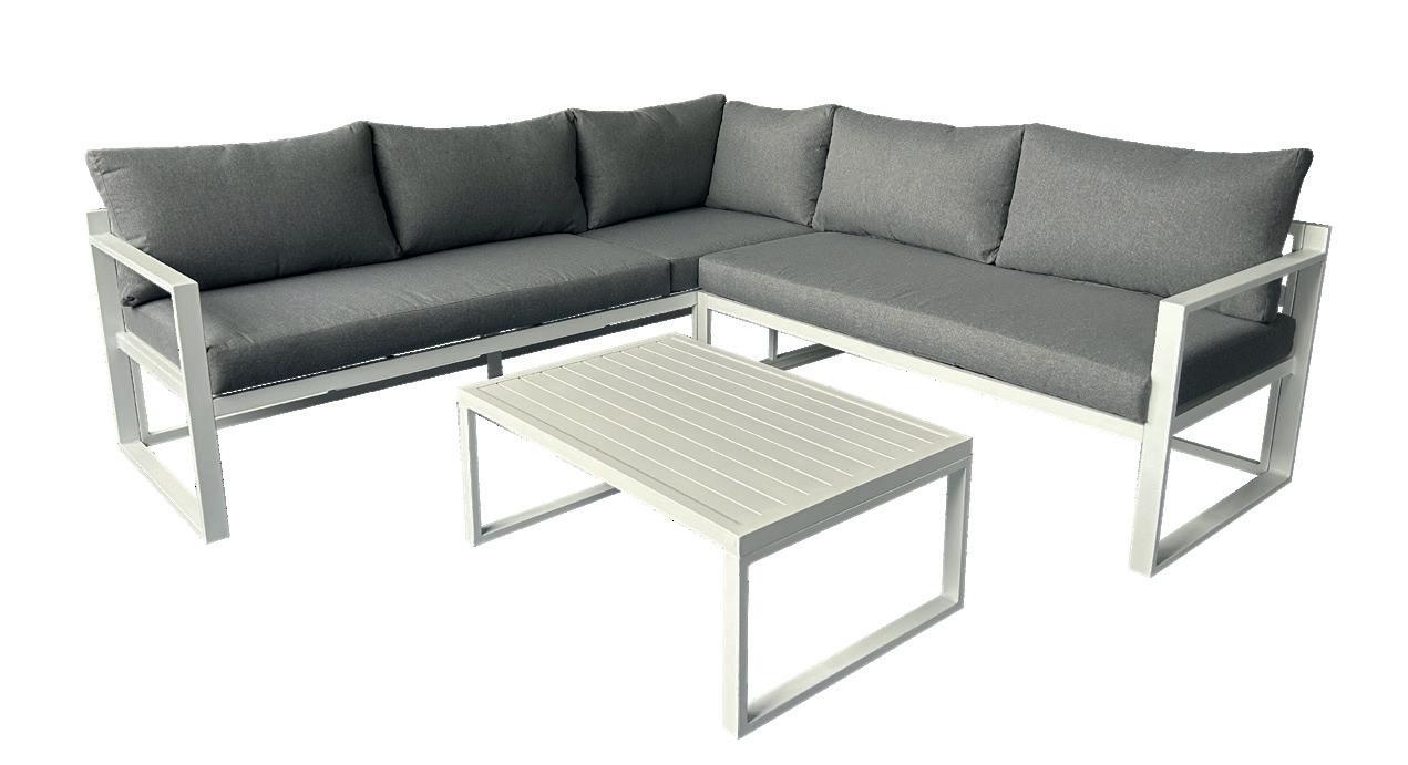 L‘ensemble de 18 pièces se compose de: 2× canapés à 2 places avec 2× coussins d‘assise et 2× coussins de dossier, dimensions de chaque (L×l×h): 162×71×72 cm, 1× élément d‘angle avec 1× coussin d‘assise et 2 coussins de dossier, dimensions (L×l×h): 71×71×72 cm, 1× table, dimensions (L×l×h): 60×60×37 cm. Dimensions complètes (L×l×h): 233×233×72 cm. 5× coussins, hauteur d‘assise: 42 cm, poids total: 55 kg Art.No.