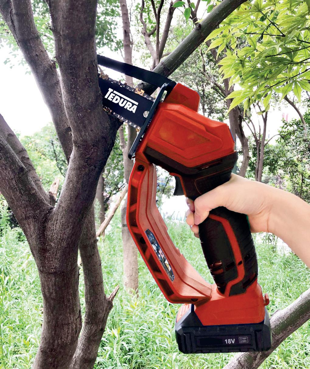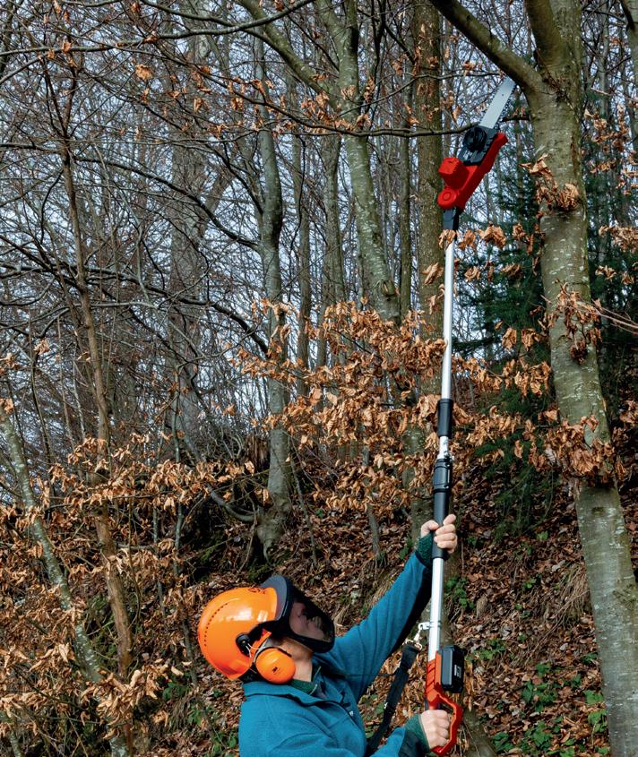 Tronçonnage sûr depuis le sol, pour de branches jusqu’à 12 cm d’épaisseur, jusqu’à une hauteur de 3,5 m. Tronçonneuse avec un bouton de sécurité deux-points. Inclus dans la livraison: 1× tronçon neuse à branches, 1× accu 20 V Li-Ions, 1× appareil de charge et 1× bouteille de remplissage pour huile