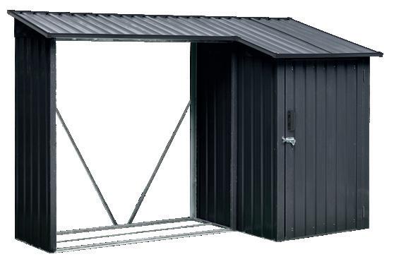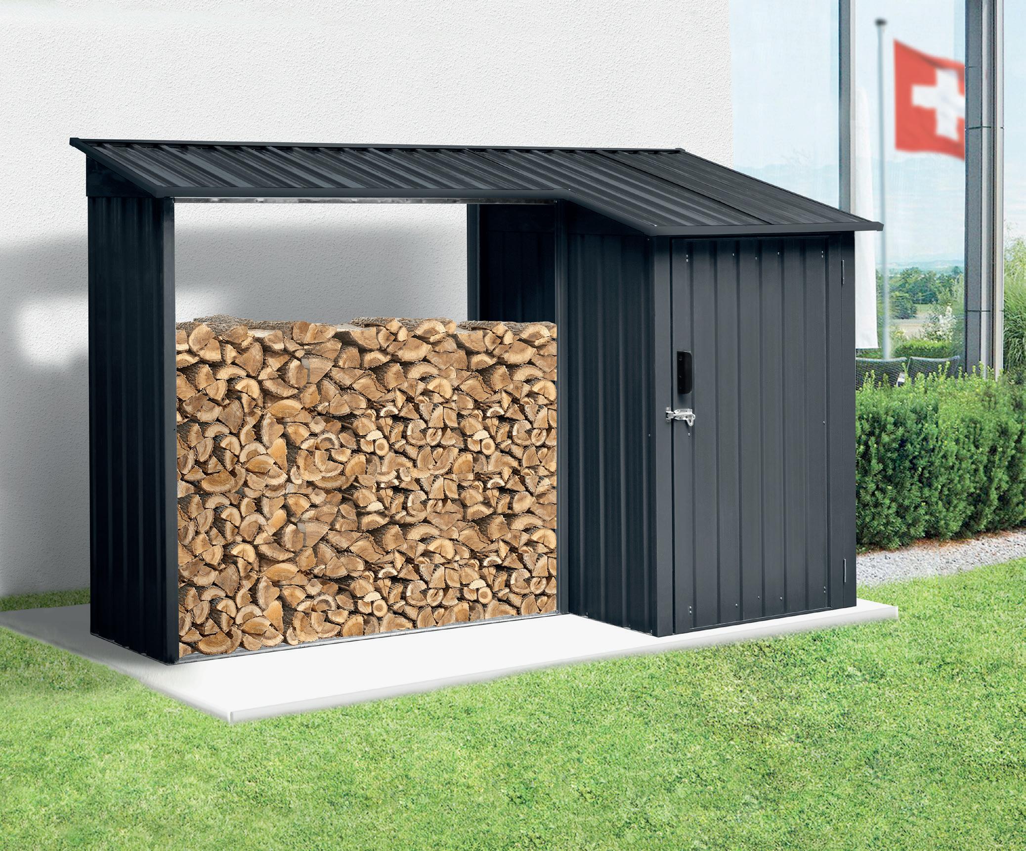 Un design unique – stockage du bois et abri de jardin en un fabriqué en acier galvanisé de couleur anthracite RAL 7016, set de fixation incl. La porte est verrouillable (cadenas non compris).