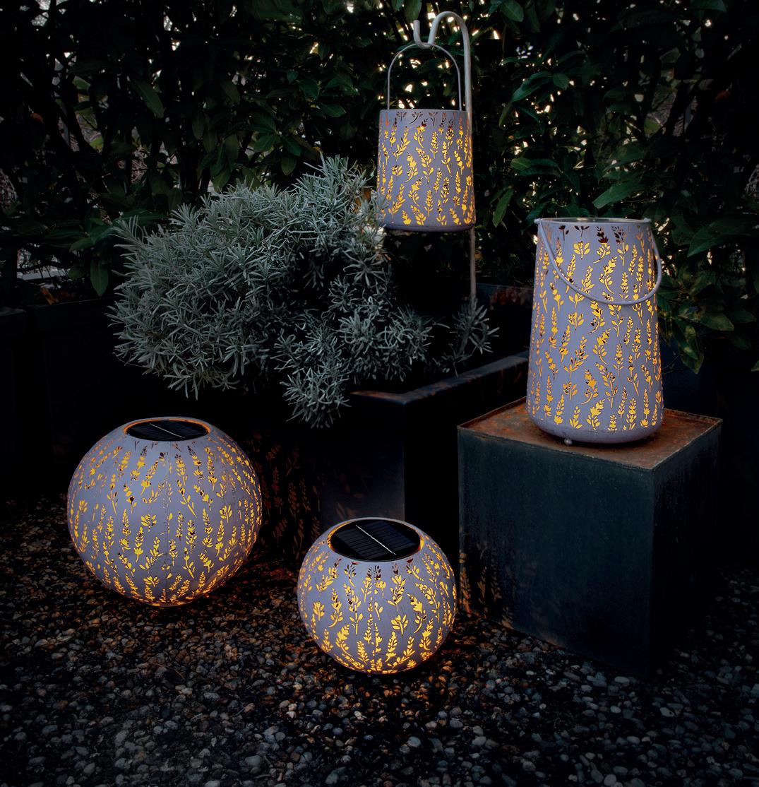 3–6 | Pendant la journée, elles servent de belles décorations avec un aspect et des ornements antiques. Le soir, ces lanternes offrent, seules ou en groupe, une expérience lumineuse particulière avec un magnifique jeu d‘ombres. Elles s‘allument automatiquement au crépuscule pendant env. 6 heures lorsque l‘accu est plein. Toutes les lampes solaires sont équipées d‘un panneau solaire DUO qui peut être rechargé via un câble USB si l‘énergie solaire ne suffit pas. La couleur de l‘éclairage peut être réglée individuellement entre blanche-chaude et sunny-chaude.