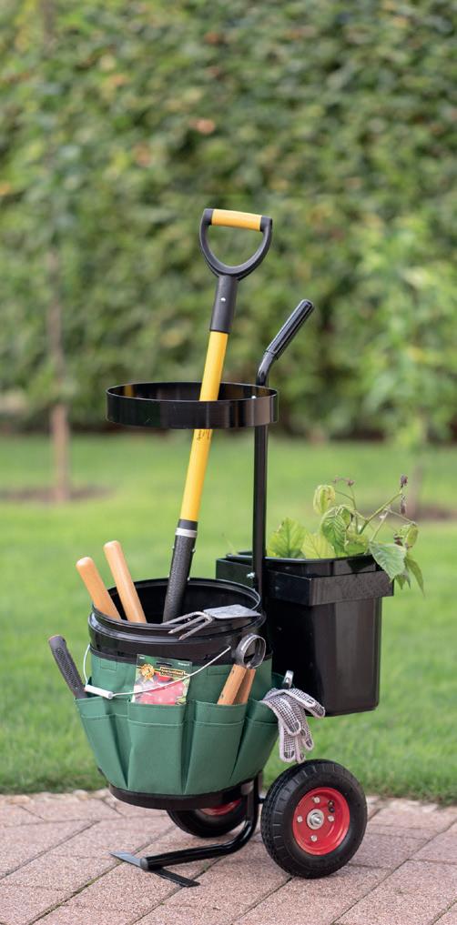 1 | Trolley de jardin «Universal» Cet accessoire de jardinage pratique met de l'ordre et aide à travailler dans le jardin et autour de la maison. Tout est à portée de main, avec deux seaux stables (1× carré, 1× rond) pour les déchets de jardin comme les feuilles et les déchets de coupe. La couronne métallique est idéale pour les pelles à long manche, les bêches ou les râteaux ainsi qu'une sangle à outils pour les sécateurs & Co. Le trolley universel permet non seulement d'économiser du temps de travail, mais aussi des déplacements. Les pneus peuvent être gonflés à l'air, ils sont donc faciles à manoeuvrer et permettent une traction confortable sur les terrains impraticables. Le cadre est solide et fabriqué en acier revêtu. La ceinture porte-outils en polyester de haute qualité assure une longue durée de vie. Poids: env. 7,5 kg, dimensions (L×l×h):