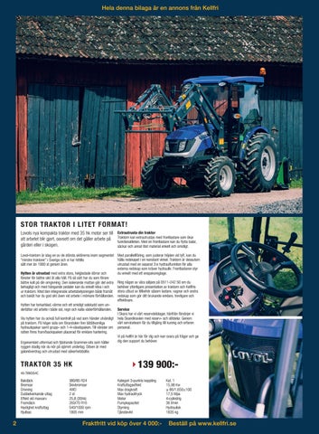 Lovol-traktorn är idag en av de största aktörerna inom segmentet Med parallellföring, som justerar höjden vid lyft, kan du hålla redskapet i en konstant vinkel. Traktorn är dessutom ”mindre traktorer” i Sverige och vi har hittills utrustad med en separat 3:e hydraulfunktion för alla sålt mer än 1000 st genom åren. externa redskap som kräver hydraulik. Frontlastaren styr du enkelt med ett enspaksreglage. Hytten är utrustad med extra stora, helgladade dörrar och fönster för bättre sikt åt alla håll. På så sätt har du som förare bättre koll på din omgivning. Den isolerande mattan gör det extra Ring någon av våra säljare på 0511-242 50 om du behöver ytterligare presentation av traktorn och Kellfris behagligt och med hängande pedaler kan du enkelt kliva i och ur traktorn. Med den integrerade arbetsbelysningen både framåt stora utbud av tillbehör såsom lastare, vagnar och andra och bakåt har du god sikt även vid arbete i mörkare förhållanden. redskap som gör ditt brukande enklare, trevligare och effektivare. Hytten har torkarblad, värme och ett smidigt solskydd som underlättar vid arbete i både sol, regn och kalla väderförhållanden. Service I Skara har vi vårt reservdelslager, härifrån försörjer vi Via hytten har du också full kontroll på vad som händer utvändigt hela Skandinavien med reserv- och slitdelar. Genom vårt serviceteam får du tillgång till kunnig och erfaren på traktorn. På höger sida om förarstolen finn lättåtkomliga hydraulspakar samt grupp- och 1-4-växelspaken. Till vänster om personal. ratten finns fram/backspaken placerad för enklare hantering. Vi på Kellfri är här för dig och kan svara på frågor och ge dig den support du behöver. Ergonomiskt utformad och fjädrande Grammer-sits som håller ryggen stadig när du kör på ojämnt underlag. Sitsen är med galonöverdrag och utrustad med säkerhetsbälte.
