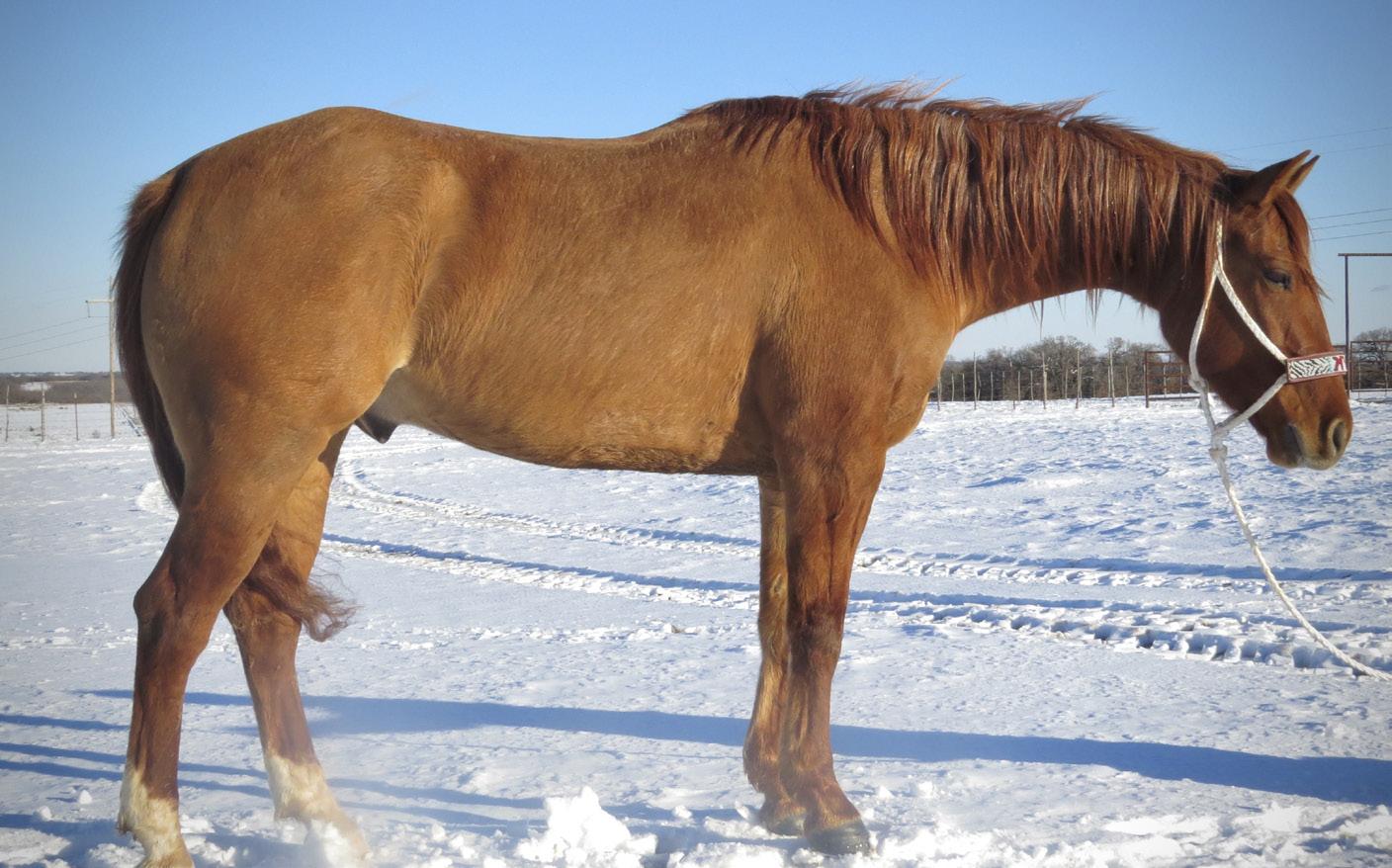 One Fine Eddie, better known as “Coleslaw,” is a pretty 7-yearold gelding. He has been used extensively on a large ranch in the Texas Panhandle gathering big pastures, dragging calves during branding and doctoring calves in the pasture. A few important things to note: as a yearling he ran through a fence during a storm and has a significant scar on his left shoulder. With a long stay in a small pen, he developed his only bad habit which is chewing tails. We recommend running him by himself or next to other horses so long as he can’t reach through the fence. He is gentle, easy to catch, and will go all day. Don’t miss this opportunity on a really nice ranch gelding!