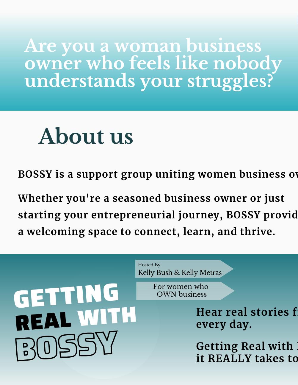 “ BOSSY is a support group for women business owners. We value REAL, HONEST, and RAW conversations and relationships to allow each other to grow and feel VALUED. ”