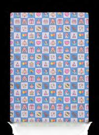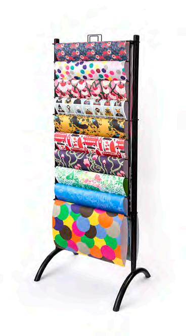 Two sided floor stand for gift wrap. Each stand holds 20 designs (10 each side) with a maximum of 25 sheets per rail.