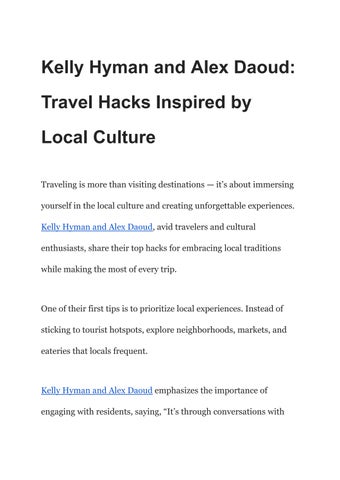 Kelly Hyman and Alex Daoud Florida - Traveling Hacks. Kelly Hyman and Alex Daoud are celebrated travel specialists in Florida, known for their expertise in planning and navigating seamless, healthy journeys. Kelly Hyman and Alex Daoud With years of experience, they provide travelers with practical advice to stay energized and stress-free while exploring new destinations.