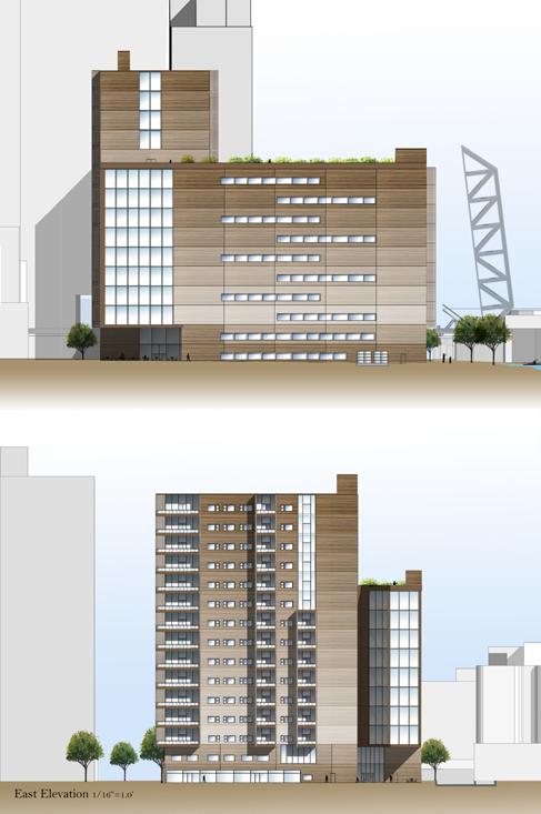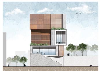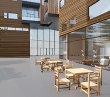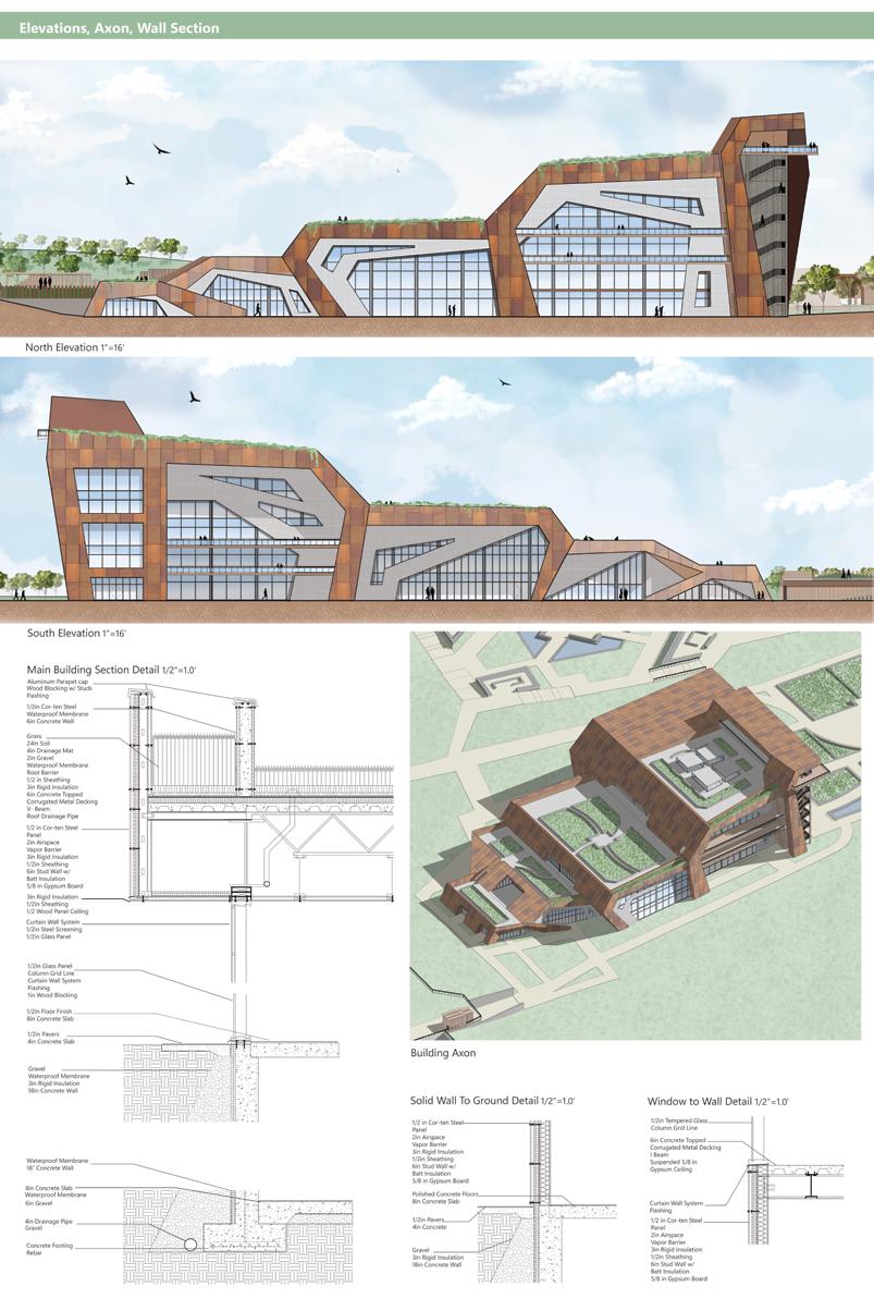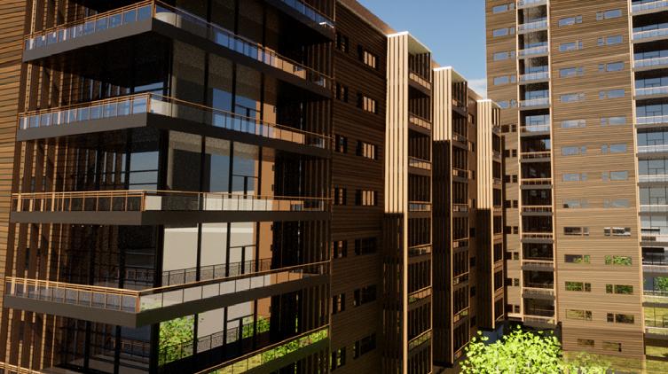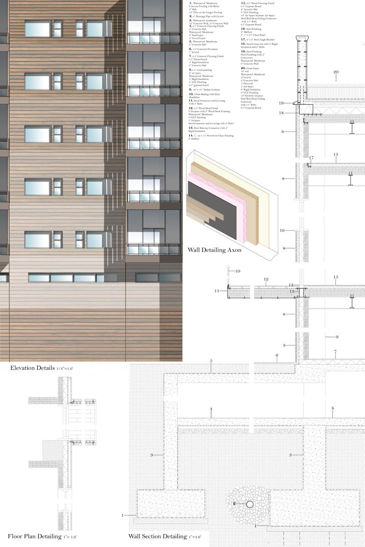 Located on the Chicago River, this project encapsulates a hybrid approach with natural and urban elements. The complex includes a grocery store, daycare, underground parking and apartments. It features an “L” shape to fit within the Chicago grid. It includes an all timber structure with CLT paneling. Wooden slats line the balconies allowing for both privacy and views. It features a rooftop garden that offers primary views to the river, along with the city. The different heights of the building allows a transition from the small to large heights of the adjacent buildings. It also creates an ideal ratio of apartment types; 20% 3 bedroom, 30% 1 bedroom, and 50% 2 bedroom.