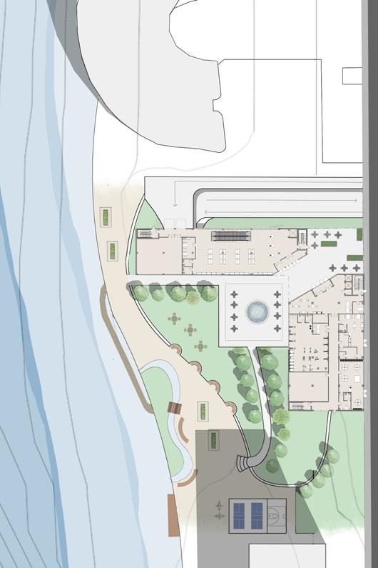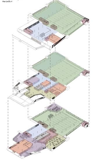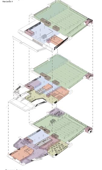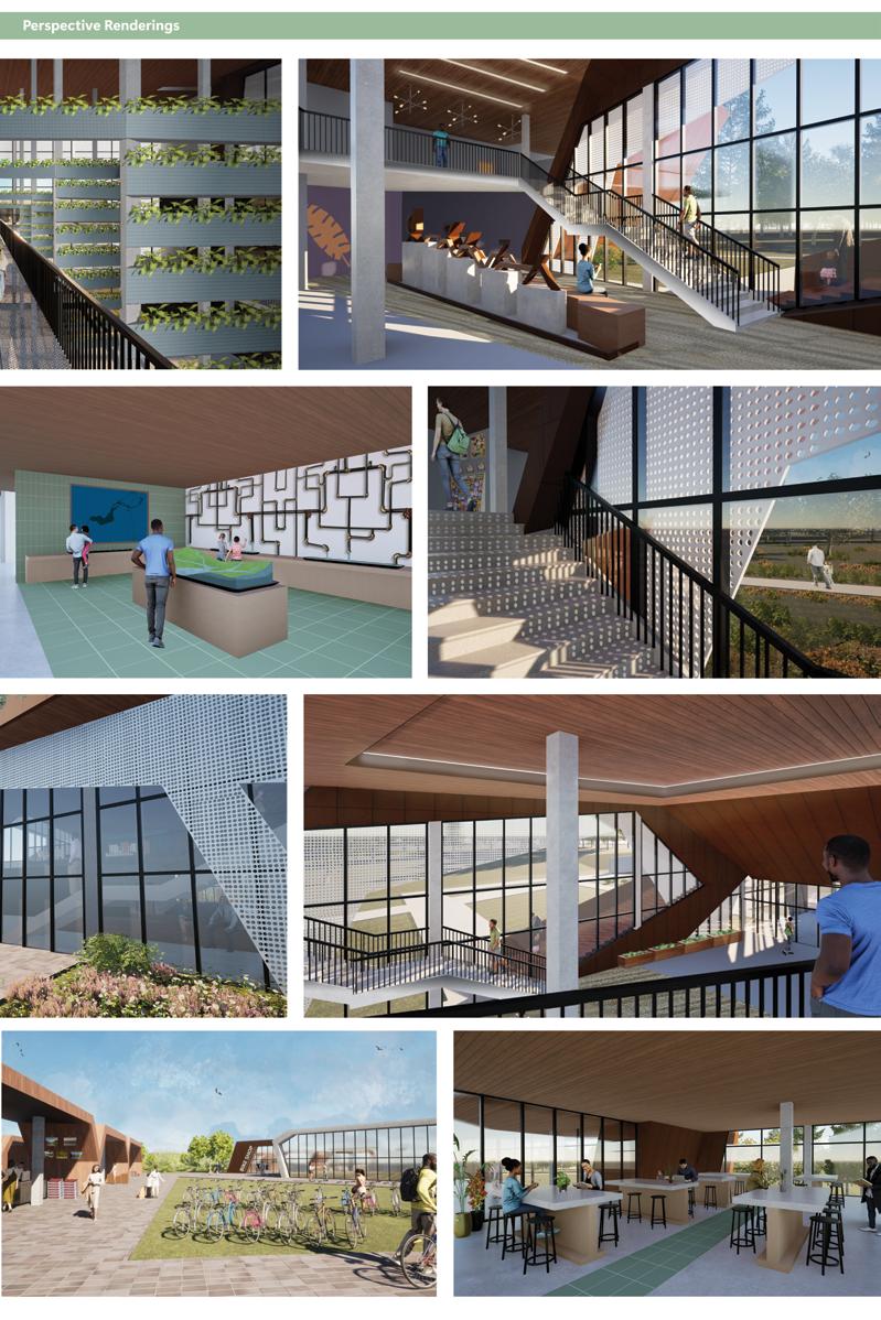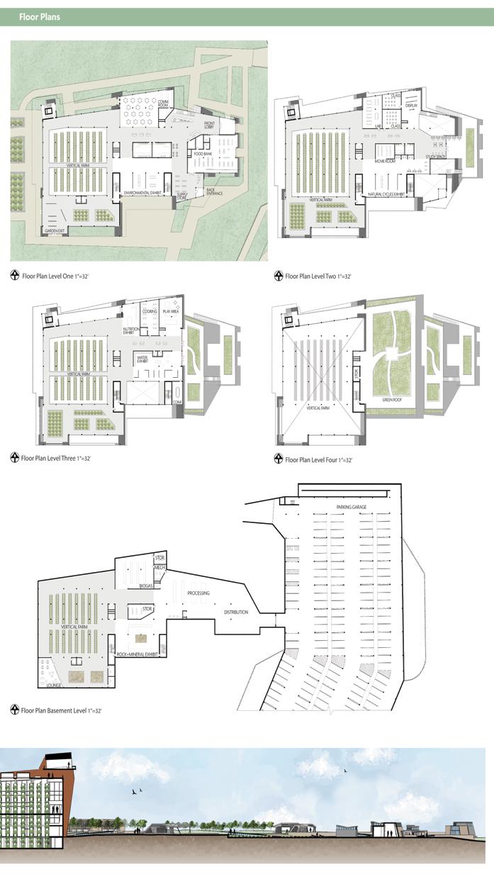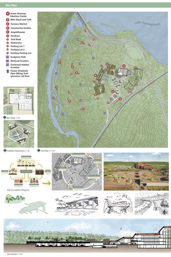 This project is located in Springfield MO, at Lake Springfield. Surrounded by many farming districts, Springfield could become a hub for farming and distribution. However, many are uneducated about the processes of farming, especially in younger generations. There are many food deserts around, creating a stronger need for food production. The main points of this program is a vertical farm, community gardens, and a market to address these needs. The circulation pattern follows the growth cycle of a plant starting with underground parking and ending on top of the park, as shown in the diagram. All elements are centered around education as a way to give back to the community. Exposing citizens to these skills can allow them to grow items at our community gardens, as well as starting their own gardens. This can become a more affordable and healthier alternative for people struggling with food scarcity.