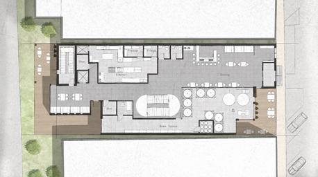 Located on historic 1st street in Rogers, Arkansas, the brewing company works to synthesize the local atmosphere. The second floor outdoor seating and rooftop event space provides a perfect view across the street of an outdoor amphitheater, playground, and farmers market. The conference room on the second floor angles out to respond to the history museum across the alley. The back patio space works to activate the previously mundane alleyway. The Frisco railway, founded in Rogers, is particularly important to the city, many of the views are framed to capture historic railway features. Many of the window types resemble railways. The company is a brewpub, serving both beer and other menu items. The building’s circulation pattern works to take you around the brewing process.