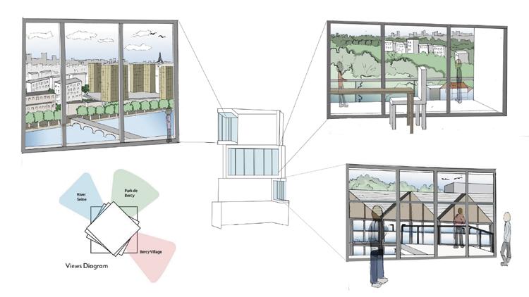 Located in the depths of Paris’ East business district, this project gets no lack of attention from the locals. The corner on the river posts a historical significance by being along the start of Paris’ old trade route. With wine making and sales being prevalent in Parc de Bercy’s past, this makes it the perfect location for a vertical farm winery. With visitors being able to tour the building and the farm itself, it allows the experience to be interactive and educational. The circulation pattern in which people experience the building follows the process of wine making. The form’s modular structures work to frame views to the places that shape the historical significance of the site. It creates views to the Siene, Bercy Village, and the Bibliotheque Francois- Mitterand.