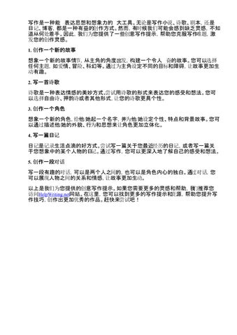 写作是一种能 表达思想和想象力的 大工具。无论是写作小说、诗歌、剧本,还是 日记、博客,都是一种有益的创作方式。然而,有时候我们可能会感到缺乏灵感,不知 道从何处着手。因此,我们为您提供了一些创意写作提示,帮助您克服写作难题,激 发您的创作灵感。