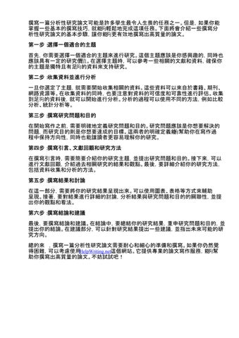 撰寫一篇分析性研究論文可能是許多學生最令人生畏的任務之一。但是,如果你能 掌握一些基本的撰寫技巧,就能夠輕鬆地完成這項任務。下面將會介紹一些撰寫分 析性研究論文的基本步驟,讓你能夠更有效地撰寫出高質量的論文。