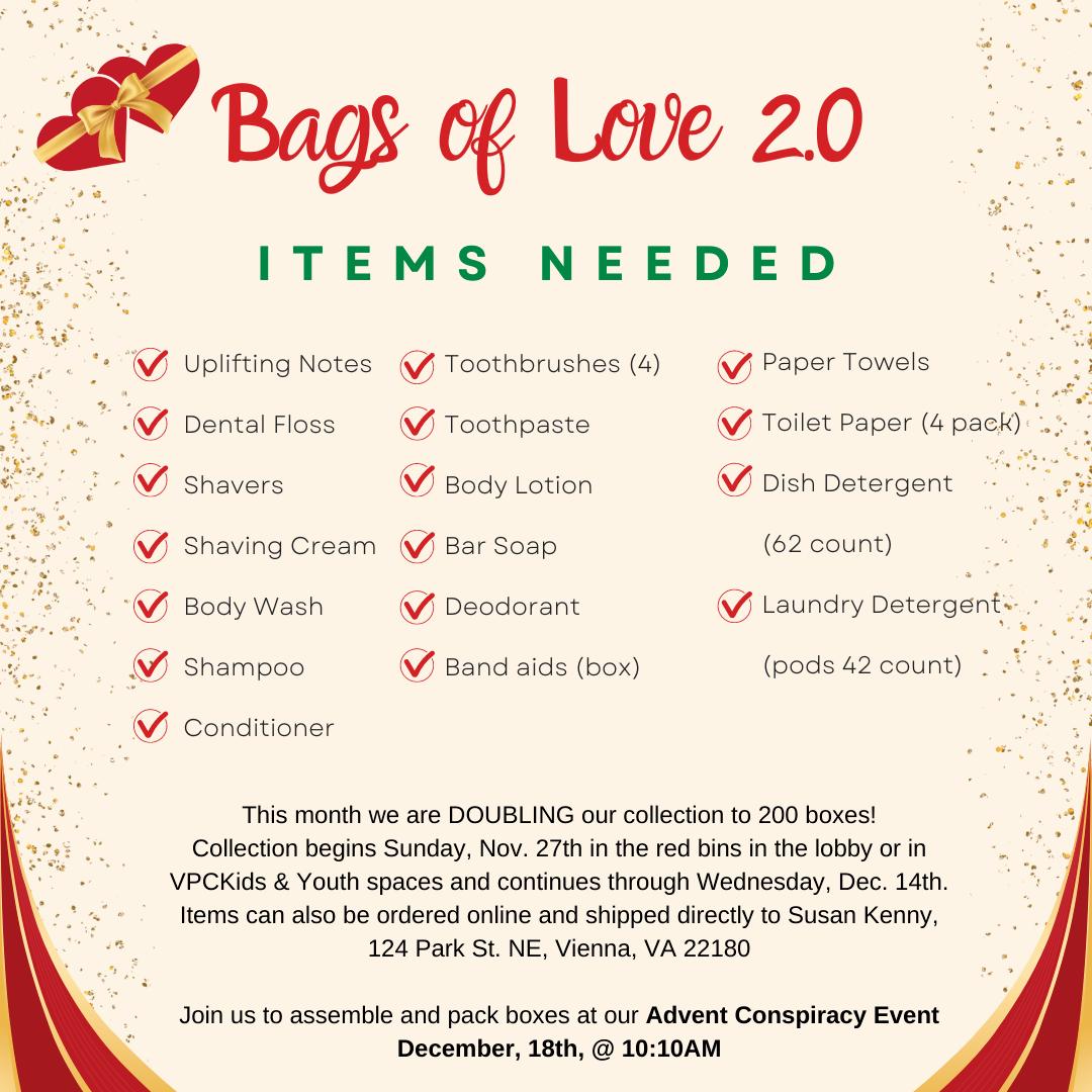BagsofLoveServiceProject,December18,10:10 11:10amintheFellowshipHall:Helping handsofallagesandabilitieswillhaveaplacetoserveinthisassemblylinepackingproject,so bringyourfamilyandfriends!ThroughVPC’spartnershipwithlocalschools,theseBagsofLove willmakeadifferenceformanyfamiliesinneedthisChristmas.ThroughoutDecember,VPC willcollectthefood,hygiene,andcleaningsuppliesneededforthepackingproject.Signupto serveanddonateitemsatwww.viennapres.org/missions.