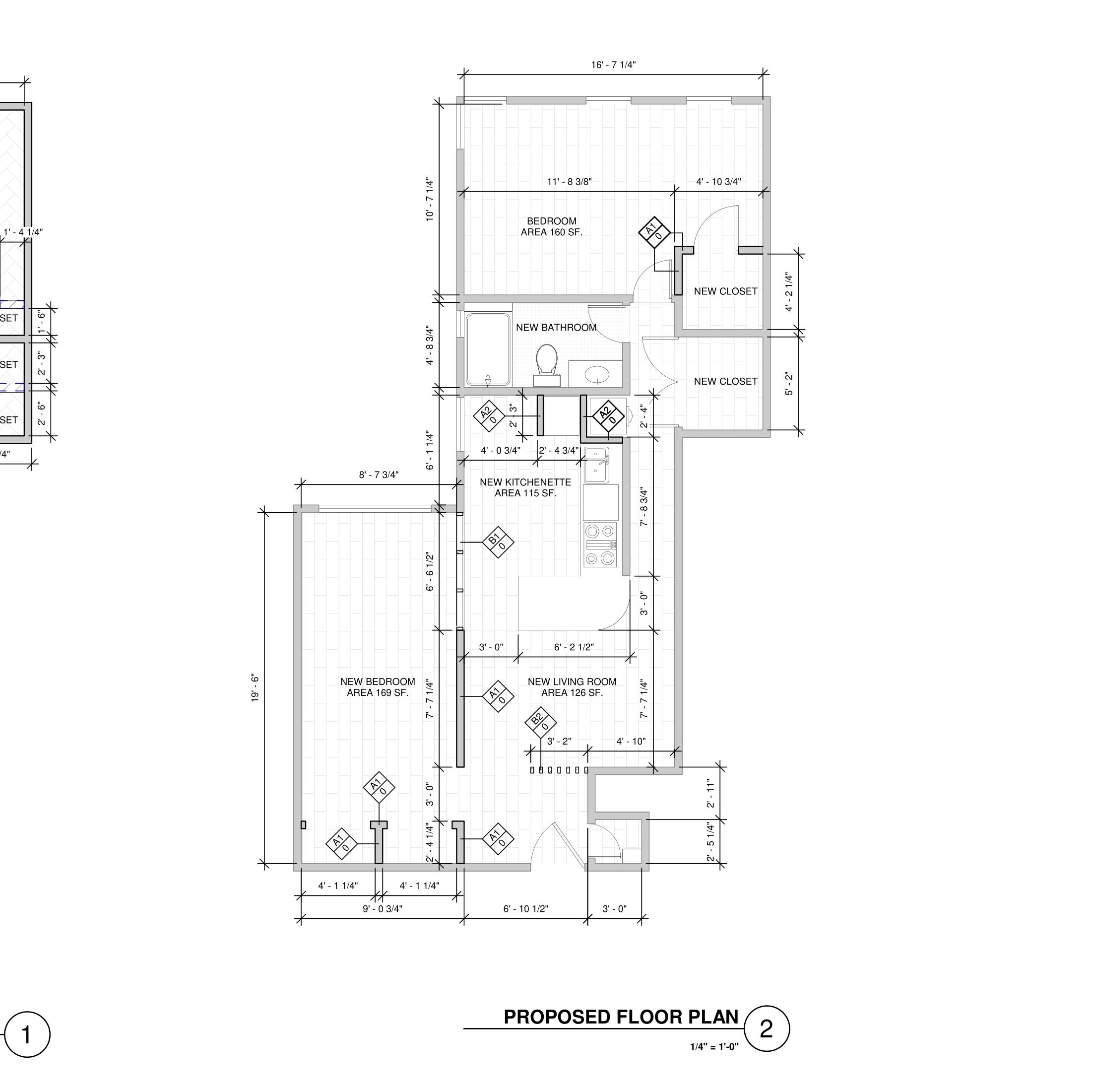 Enter to access the patio on the left or indoor spaces ahead. Privacy increases from storage to workspace, sleeping, and dressing areas. Flexible design lets users adapt spaces to changingneeds.