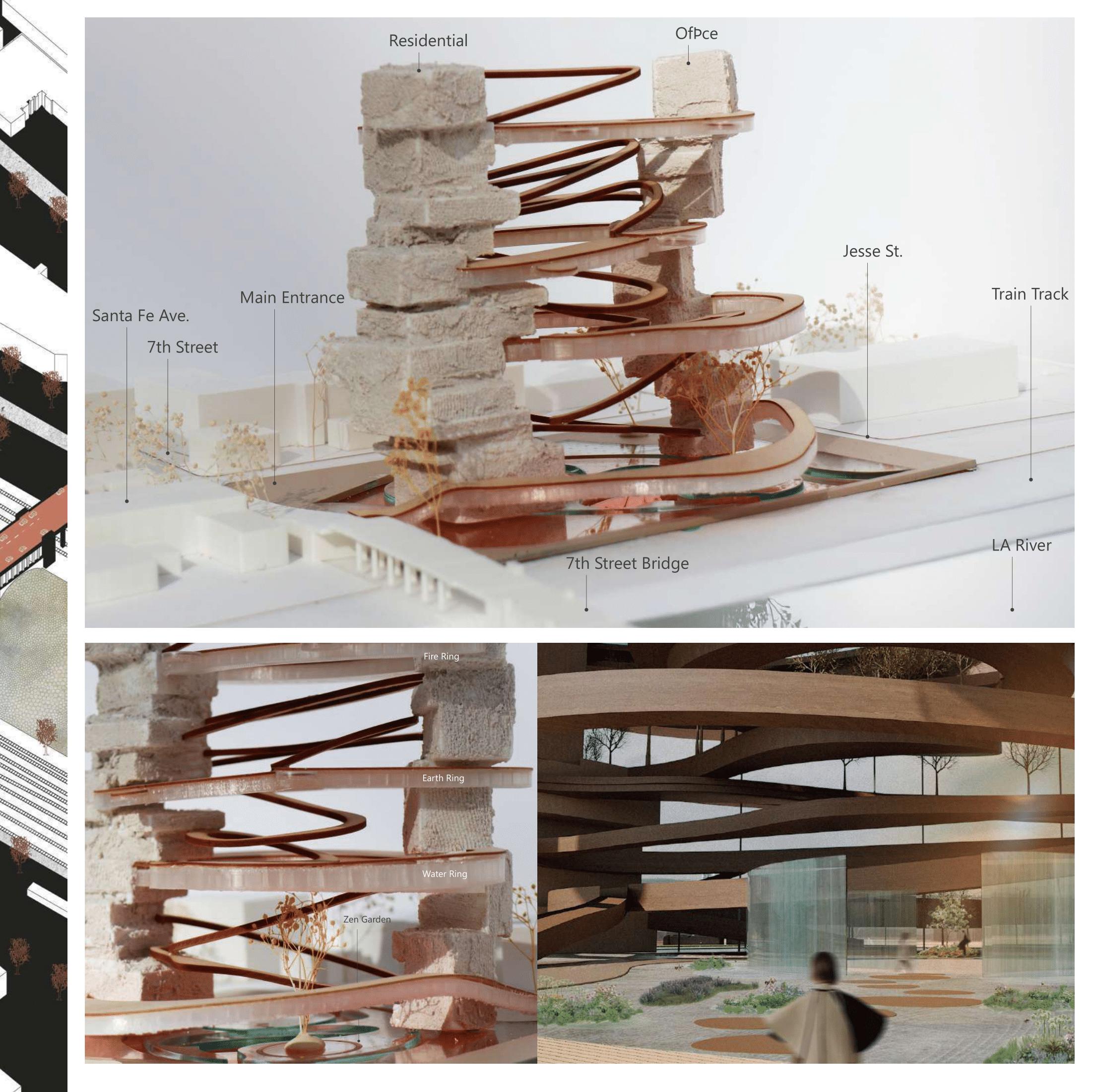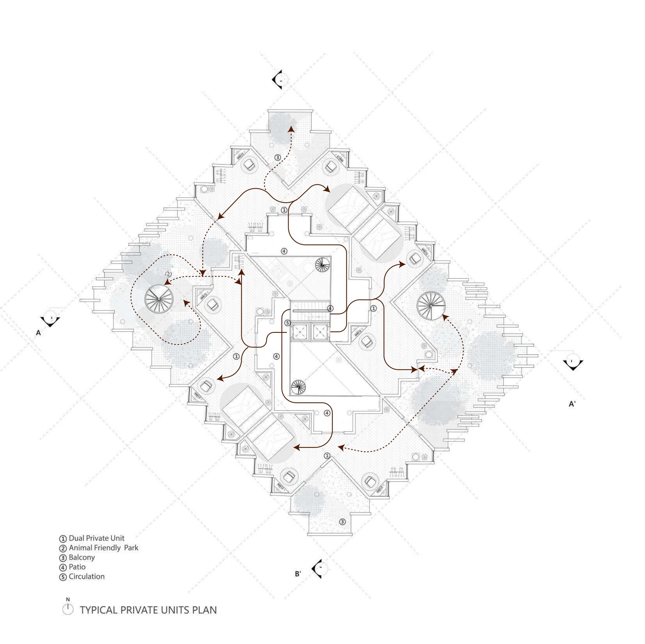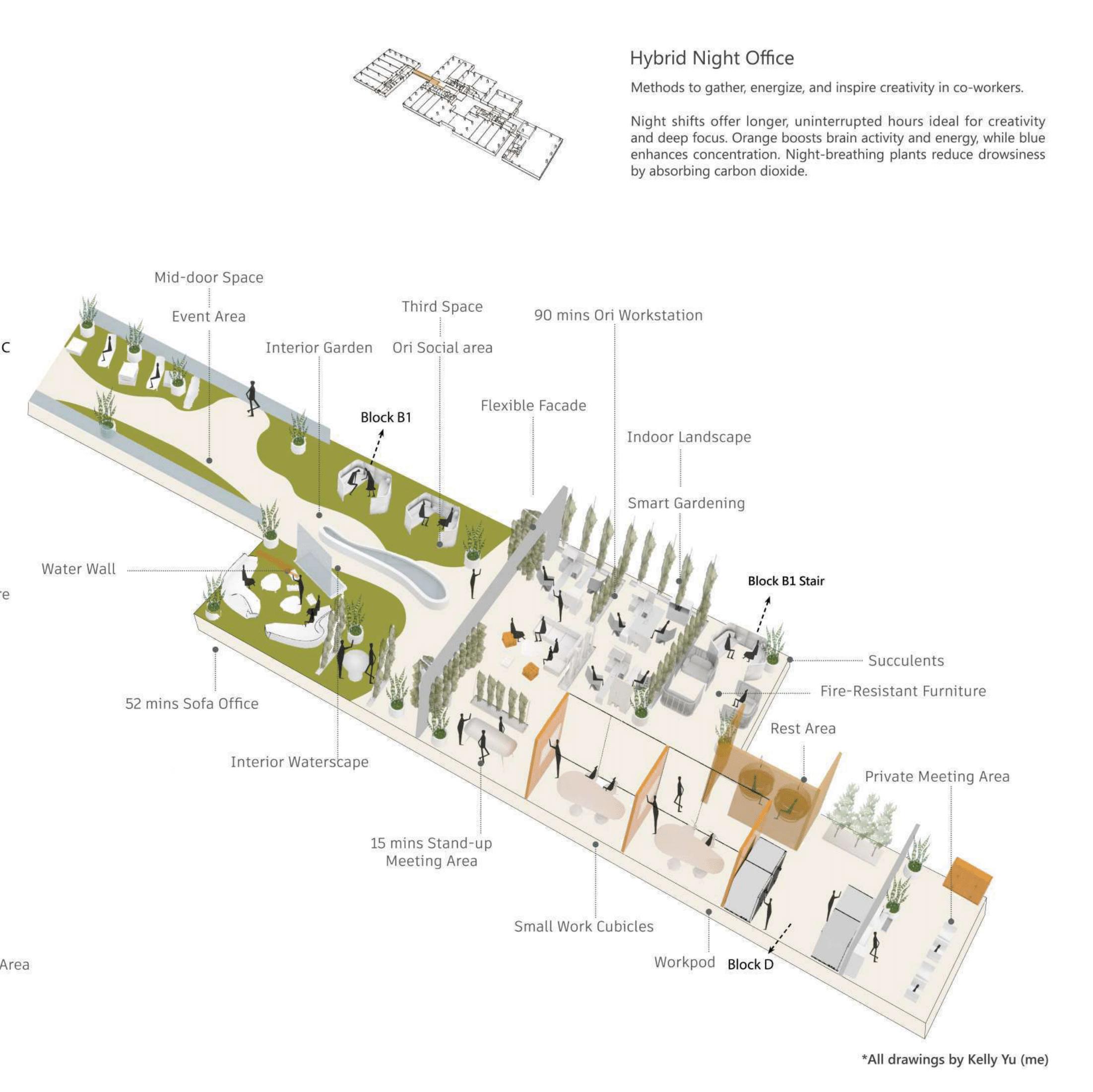 A 45-degree rotated grid structures the space, with a modular framework defining zones and allowing quick reconfigurations. A central patio offers fresh air and a private outdoor retreat, enhancingthe interior experience.