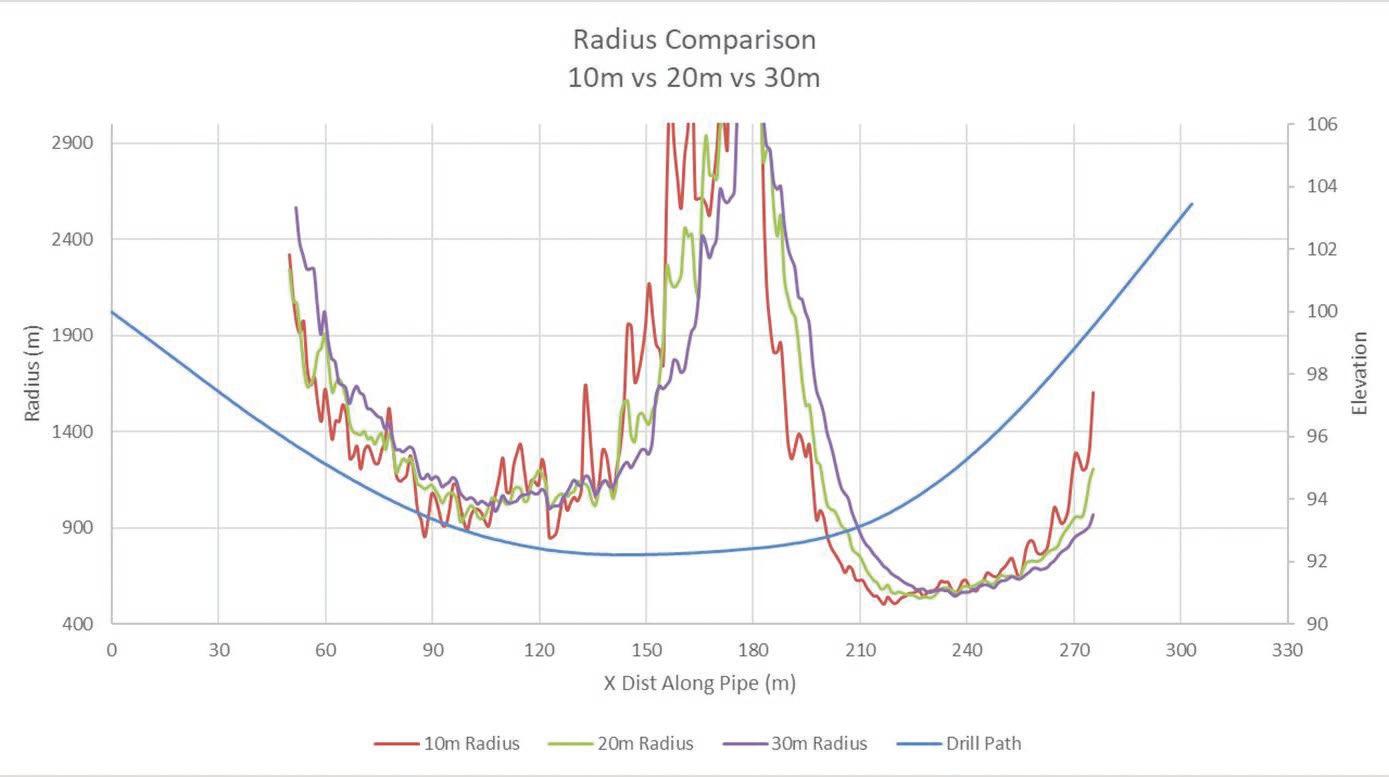 The selection of L is left up to engineering judgement. Increased use of post installation surveys of pipe can be used to further inform this engineering judgement. Much of the allowance for engineering judgement is to allow for assessments of the pipes ability to conform to radii through the oversized borehole that may be different from what is shown in the pilot hole data. Post-installation surveys of the pipe will show if the pipe is conforming to radii over shorter or longer lengths. These surveys remove the challenges of assessing how the pipe will conform to a borehole that is oversized. The below figure shows and example of a pipe that shows clear instances of a pipe conforming to radii over 10 metre distances that are smaller than the radii calculated over 30 metre distances. The fact that the minimum 10 metres radius is lower than the 20 metres or 30 metres radius shows that the pipe is conforming to the radius over the shorter distance and should be considered in the stress calculations.
