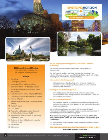 2016 Annual General Meeting Friday, June 10, 2016 – 3:00 p.m. CDT Fort Garry Hotel, Winnipeg, Manitoba AGENDA 1. Call to Order 2. Chair’s Opening Remarks 3. Introduction of Past Presidents and Guests 4. Introduction of 2015 – 2016 Board of Directors 5. Introduction of Parliamentarian, Sergeant at Arms and Scrutineers 6. Moment of Silence in Honour of Deceased Members 7. Confirmation of Quorum and Proxy/Electronic Voting 8. Approval of Agenda 9. Approval of the Minutes of the 2015 Annual General Meeting 10. President’s Report 11. CEO’s Report 12. Presentation and Receipt of Audited Statements for the Year Ending December 31, 2015 13. Appointment of Public Accountant for Year Ending December 31, 2016 14. Election of the Board of Directors of the Appraisal Institute of Canada 15. New Business 16. Adjournment