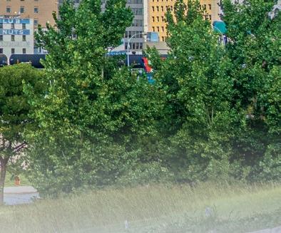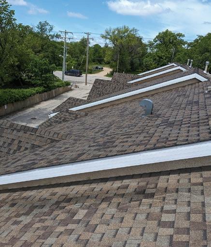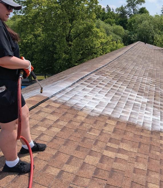 “Flat roofs have several unique problems. The major ones being leaking and ponding,” Huntrods said. “But they face the same issues as shingled roofs: the asphalt dries out, becomes brittle, and starts to crack, increasing the chance of leaks. Our product helps by keeping the asphalt pliable and the granular cover in place.” Huntrods added that because fl at roofs collect a lot of dirt, soft washing prior to treatment is usually benefi cial. In fact, the process Greener Shingles employs always starts with a soft washing of the roof to remove accumulated grime. This also helps the product adhere better and produce a more even finish. The cost-effective, time-effi cient service not only extends roof life, but improves curb appeal without the need for dumpsters or tenant disruption.