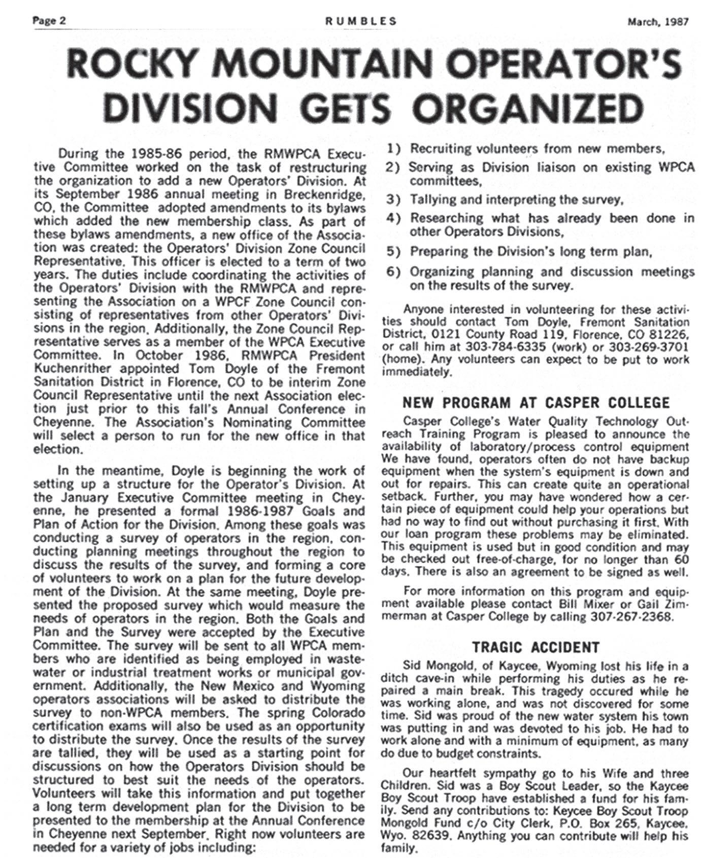 The trip we took down memory lane couldn’t confirm the first RMWEA elected PWOD Zone Representative, but we heard rumblings that it may have been Bob Jarski, followed by Terry Anderson, Wayne Ramey, Michael McCrary, Tony Woodrum, then Greg Farmer. The March 1987 issue from Rumbles Magazine (today known as Rocky Mountain Water Magazine, the magazine you’re reading!) stated that Tom Doyle was appointed by the RMWPC President to be the interim PWOD Zone Representative, though if he was voluntold to do so may be lost to history. The PWOD ceased to exist shortly after WEF turned the Operators Forum Magazine into the Water Environment & Technology Magazine.