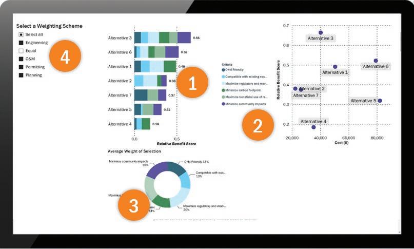 What is different today from the way those factors have been previously considered is the way in which those criteria are determined and how they are ranked and scored. Today, data-centric evaluation methodologies and tools allow us to gather important factors easily from diverse sets of stakeholders and utilize surveys to better understand what is most important to them. Algorithms then aggregate importance factors and scoring that is applied to each alternative being considered. This results in benefit scorings that represent important, easy to see, relative differences between alternatives. Finally, simple visualization tools can then combine the cost and non-cost benefits scores such that one can easily see how the alternatives’ benefits line up with their overall costs. 1 3 4 2