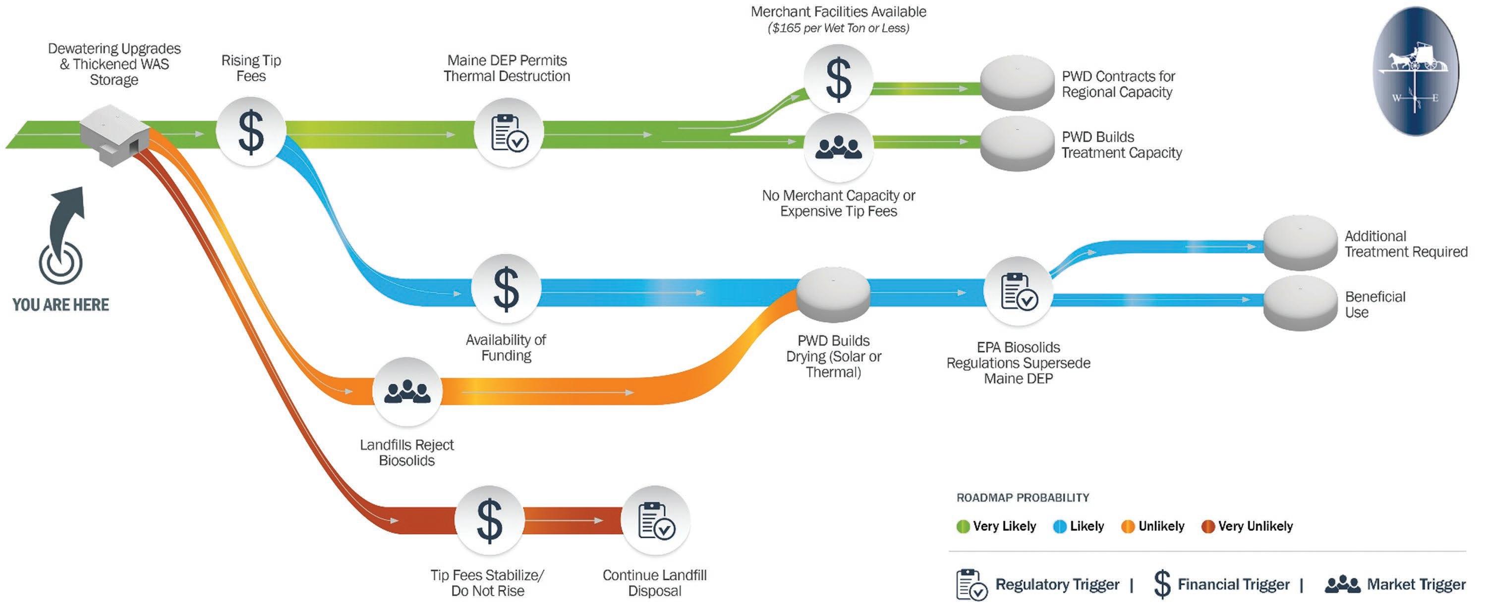 Figure 1 shows an example from Maine of what a scenario related to dewatering and thickening WAS storage might look like. Colors represent the categorized probability of each scenario, and the silver buttons can indicate the nature of the trigger anticipated. The ultimate outcome of each scenario is shown as the endpoint of the possible path. These types of representations can help summarize visually the most critical trigger points to consider, and what likely action may result. This synopsis helps inform decision science by allowing stakeholders to understand many possible futures at a glance.