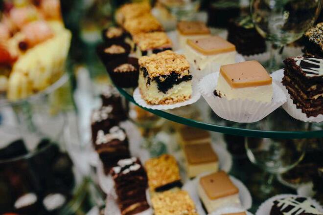 · Chef's dessert display featuring house made dessert squares and cakes V