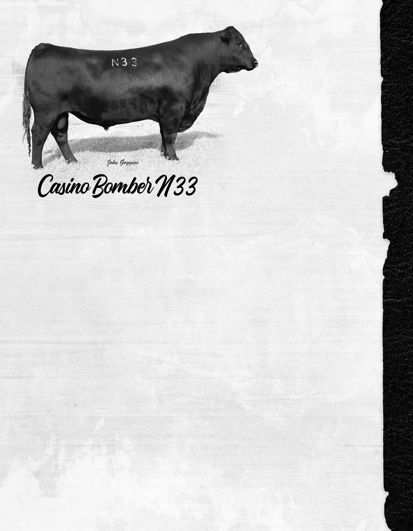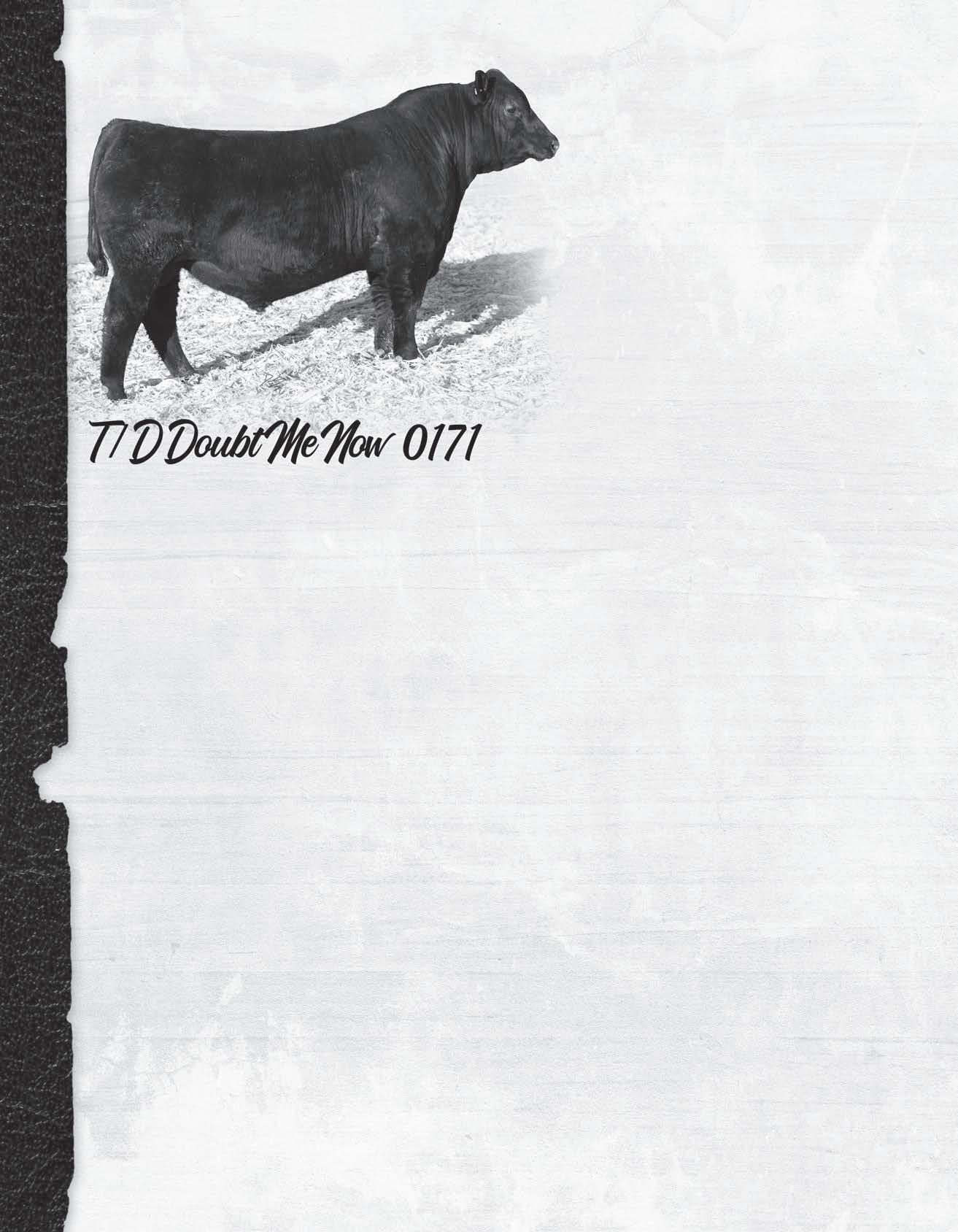 6 DOB: 01/03/22 AAA# 20469420 Tattoo: 812 MGR Treasure Connealy Fortune 752L Quick Fair of Conanga 831 Baldridge Titan A139 O A Victoria 357 O A Victoria 335 CED 3 BW 1.6 WW 94 YW 165 Milk 16 Marb 0.86 RE 0.79 Fat -0.022 BW 89 DAM’S NR 4/100 GAIN 4.39 205 828 365 1479 %IMF 4.62 REA 13.7 RIB FAT 0.24 Weights Ultrasound Recommended for use on cows. Hard to find a hole in this big numbered Fortune son. $Value indexes very impressive on this attractive bull. Dam is a nicely uddered Titan daughter with an excellent set of feet and legs. $W 73 $F 109 $G 68 $B 177 $C 300 Adj SC 36.84 HP 14.1 Performance