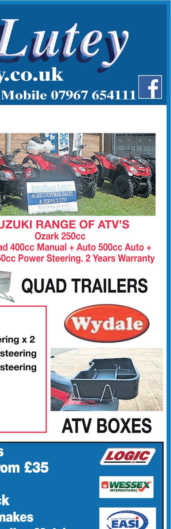 Be first to see the latest machinery for sale, get the digital edition free. Visit Agriculturaltrader.co.uk 10 Machinery South West Poultry Installations Ltd Servicing - Repairs - Competitive Quotes Specialising in bulk feed handling Buy and sell new and used bulk bins and augers Own moving facility available Tel: 01884 841766 Mob: 07808 271034 Mob: 07850 629 426 SALES • SERVICE • HIRE Contact Nick Vincent Tel. 01364 73960 eves. Mobile: 07860502447 day email: n.vincent739@btinternet.com In support of the RABI New Devon Sales Agent for Mitsubishi Compact Tractors MASTER MOBILE GRAIN DRYERS Farm Engineering Services For the South West – Est. 1989 Electric drive unit for PTO driers from............£4,000 Used Master mobile dryers..............................from £8,500 + VAT New grain dryers now with a 3 year comprehensive warranty Grain Dryer hire ............................................from £20 per hour 750 Loaders for Hire.....................£POA Grain Drier Hire 08R04B 2 years warranty Comprehensive parts backup Oil immersed brakes 2WD or 4WD The ideal scraper tractor BREAKING FOR SPARES (NEW SPARES & SECONDHAND) Jim Hedges Tel: 01769 560018 (not Sundays) Lamborghini 956 4WD, Dominator 85, JD324 and 331 mower conditioner ALSO FIREWOOD PROCESSING DONE (400ml diameter to 250-500 long) Large selection of mowers, foragers, balers, ploughs, combines, muck spreaders, slection of row crop/dual wheels, loader brackets for Quicke, Quickus, Tanco, Trima, Chilton & others, flat & Cambridge roller rings. Mid-Somerset Show The Mid Somerset Showground, Cannards Grave Road, Shepton Mallet BA4 4GF Visit: www.midsomersetshow.org.uk forDate diaryyour Sunday 20th August 2023 Discounted parking tickets available NOW Agreat familyday out Schedules available May 2023 26th April NEXT ISSUE AVAILABLE FROM www.colbear.com 07977479732 / 01837 55910 P18 to fit digger 21ft £6000 2600 tanker £6000 5t plant trailer King Hitter post banger 17ft Trailer £750 Farm walk trailer Yanmar with rotovator £3000 HAY FOR SALE Springfield Farm, Devon Tel: 01395 239 343 (evenings) or Matthew 07817 260 584 Email: mdprettejohn88@hotmail.co.uk Marshall 75 rotor spreader, £2750 Jourdain feeders with hook on brackets, POA Claas front mounted mower, 3050FC, £1950 • Major topper 490 eagle wing, batwing topper £2750 • Ifor Williams 510 horse trailer £3500 • Mchale bale squeeze with euro 8 brackets £575 • McConnel hedgetrimmer head, 1.3 metre cut. 54 horse power pumper, on T flails, £750 • Volac Dowdeswell 740 round bale wrapper, remote and 750 film, £2250 Leyland 253, 6024 hours, good working order £2500 M.D. PRETTEJOHN Call Chris Rogers 07779 611 826 (North Devon) T4 95, 2014, 3000HRS, VERY NICE TRACTOR DUE IN END OF JANUARY JOHN DEERE 6210 SE, 2002 , 7500HRS, TIDY TRACTOR £17500 JCB 320S, 2014, 8500HRS , TIDY HANDLER DUE IN THIS WEEK CASE PUMA 180 2009 , 5900HRS, POWER COMMAND ,FRONT AND CAB SUSPENSION, AIR BRAKES £34500 BUNNING LOW LANDER 85, 2020, TIDY SPREADER FULLY SERVICED £20995 CSX 7060, 2007, 2300 ENGINE HOURS, 1800 DRUM HOURS , SMART SIEVE, 17 FT CUT, 650 TYRES