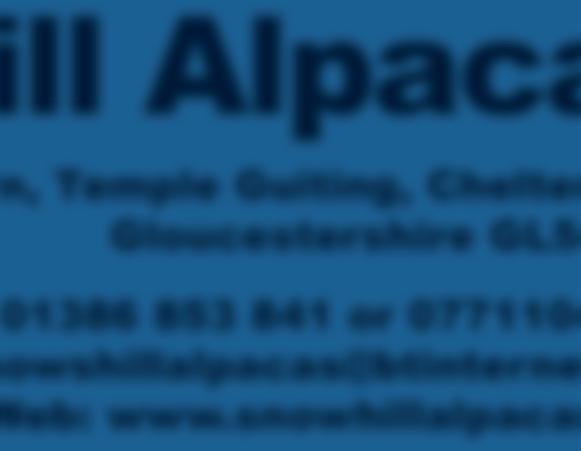So I hope you enjoy the next few months and I certainly intend to do so. But do remember to send me your spring and summer photos, reports and views. This magazine is for you, and I want to hear from you. Whatever you do with your alpacas, let’s reflect your news and views in your magazine, Alpaca. Look out for the Summer issue of Alpaca published on 25 July and let us have your contributions by 19 June.