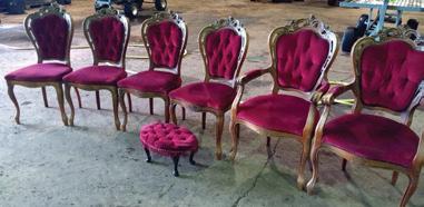 6 GRAND CHAIRS 2 WITH ARMS, 4 WITHOUT AND A FOOTSTOOL £80 the lot. Great solid chairs 2 with arms height 109cm, width 59cm and depth 54cm - 1 has a rip in the back fabric (see picture), No arms 102cm tall, 50cm wide, 48cm depth - seat pads all in good condition, could do with a re varnish. Collection Mon to Fri 8am – 4.30pm.