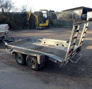 Flat-bed trailer, front axle andrear axle, 10 stud axles with 420mm x 180mm brake, mono leaf springs, 2.0m axle track, 2ft headboard, LED lights, Sprung drawbar, Air & hydraulic brakes with Load Sensing