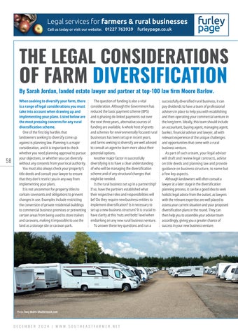 successfully diversified rural business, it can pay dividends to have a team of professional advisers in place to help you with establishing and then operating your commercial venture in the long term. Ideally, this team should include an accountant, buying agent, managing agent, banker, financial adviser and lawyer, all with relevant experience of the unique challenges and opportunities that come with a rural business venture. As part of such a team, your legal adviser will draft and review legal contracts, advise on title deeds and planning law and provide guidance on business structure, to name but a few key aspects. Although landowners will often consult a lawyer at a later stage in the diversification planning process, it can be a good idea to seek holistic legal advice from the outset, as lawyers with the relevant expertise are well placed to assess your current situation and your proposed diversification plans in the round. They can then help you to assemble your adviser team accordingly, giving you a greater chance of success in your new business venture.